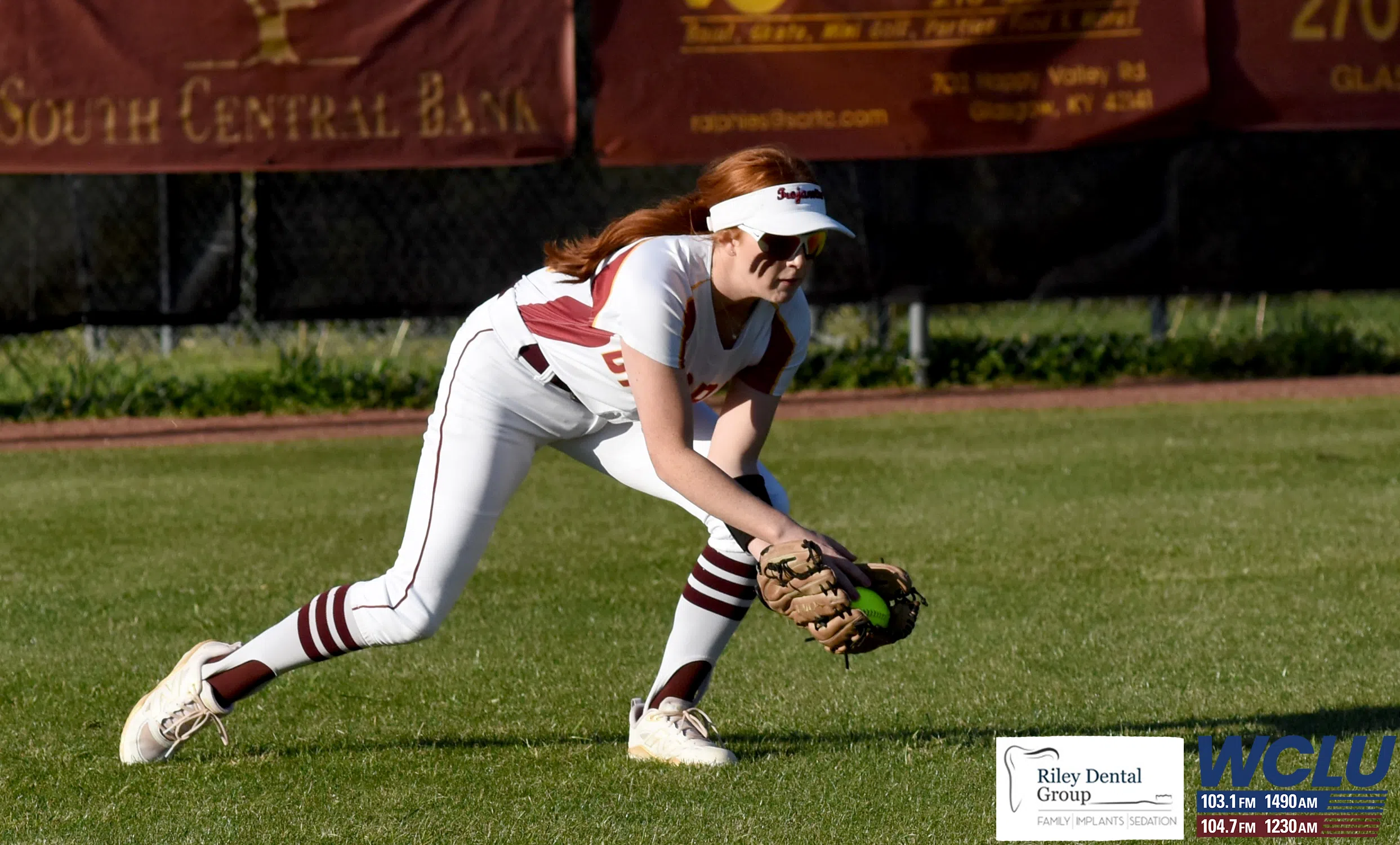 Barren County’s Kyra Moore settles under a fly ball in left field against Warren East in a 15th District contest. The Trojanettes won, 10-4. James Brown/WCLU Sports
