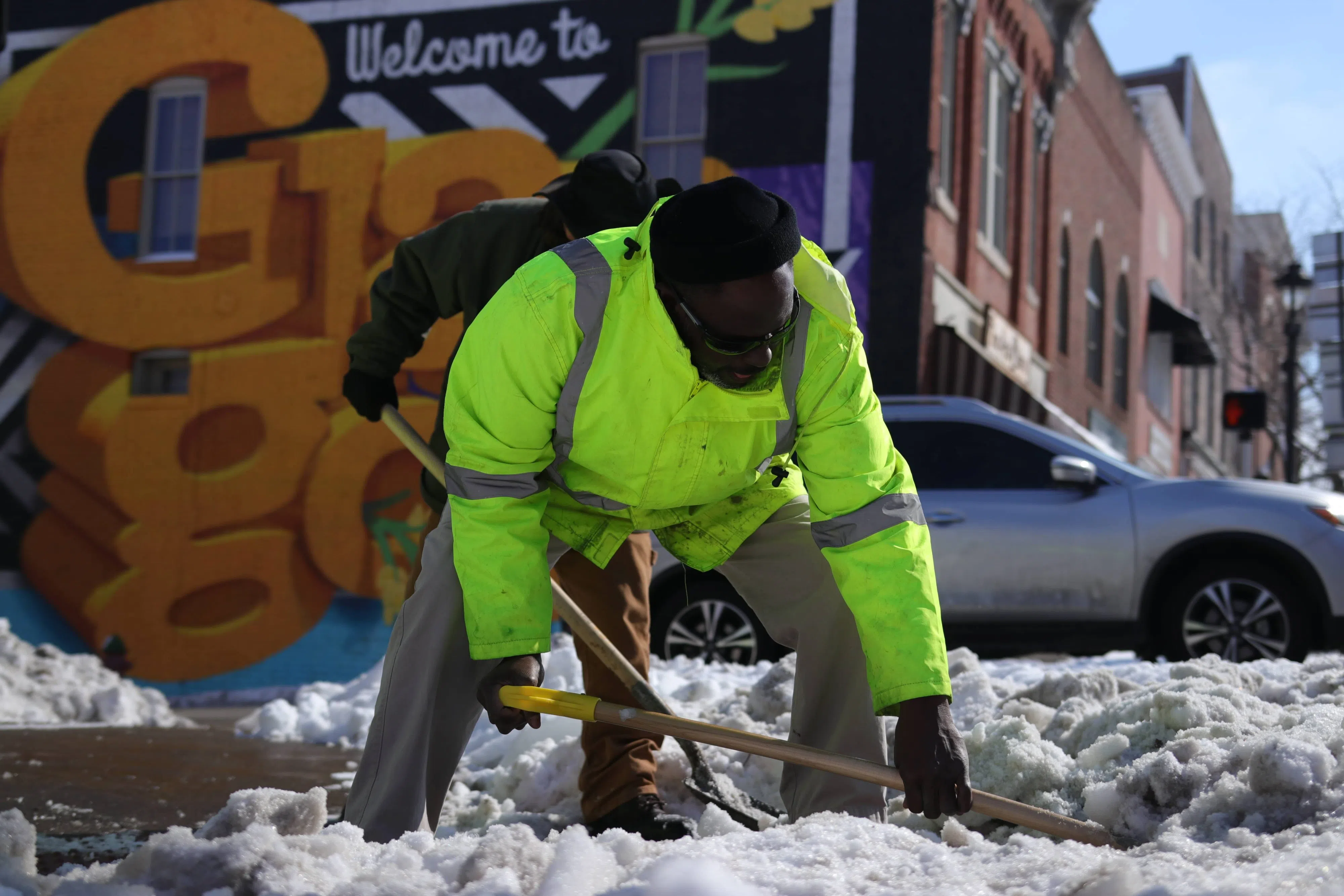 Three crew members with the Department of Public Works were working Friday morning at the corner of North Race Street and West Main Street. The sidewalks across the city remain snow covered.