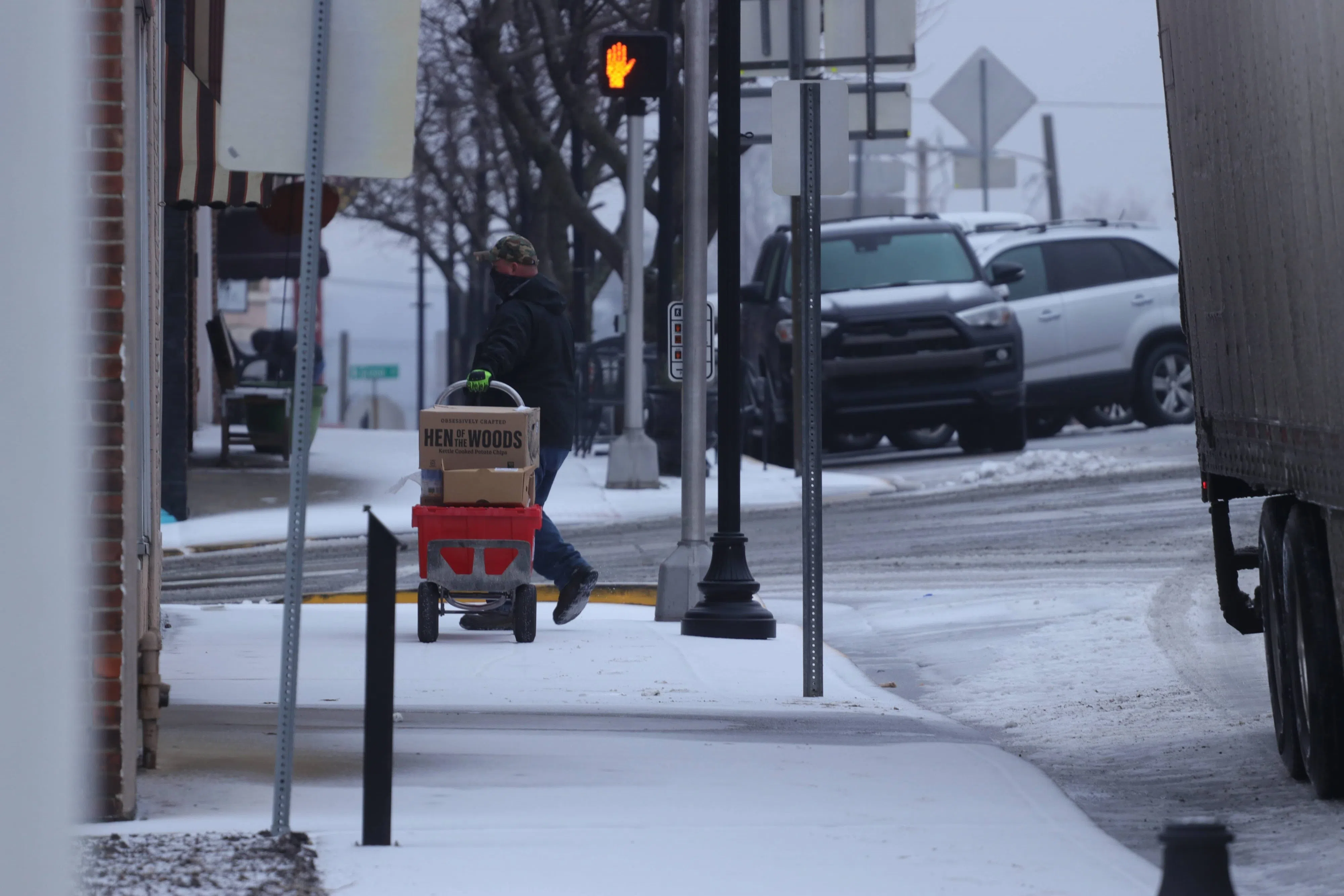 A man totes a delivery along the sidewalk near the corner of West Main Street and North Race Street in Glasgow during snow showers on Feb. 15, 2021.