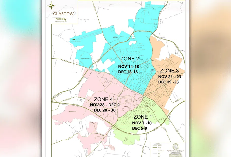 According to a map released by the city of Glasgow, the collection will occur across four zones and last through Dec. 30. Each zone has been assigned two weeks.