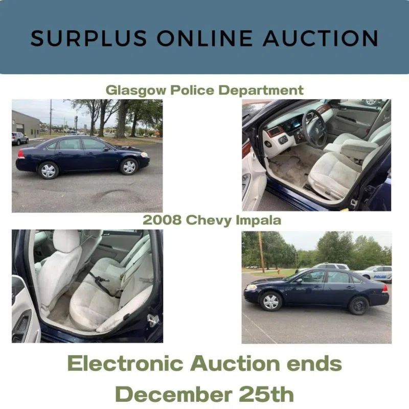 (December 12, 2023) Glasgow, KY — The Glasgow Police Department has a surplus 2008 Chevy Impala up for auction.