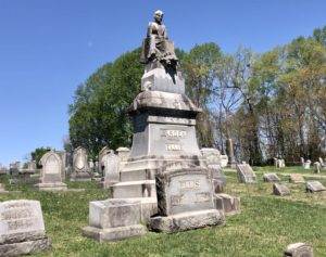 She died young and her distraught husband left money for a substantial monument to be erected and the lot to be cared for in perpetuity. Carden’s nephew and namesake, Lucian Carden Preston, (buried in the neighboring lot) was the trustee and overseer. The likeness of Ella was noted by her contemporaries as being extremely lifelike. The detail on the monument is outstanding, with Terry calling special attention to the detail of the “fabric” adorning the bust.
