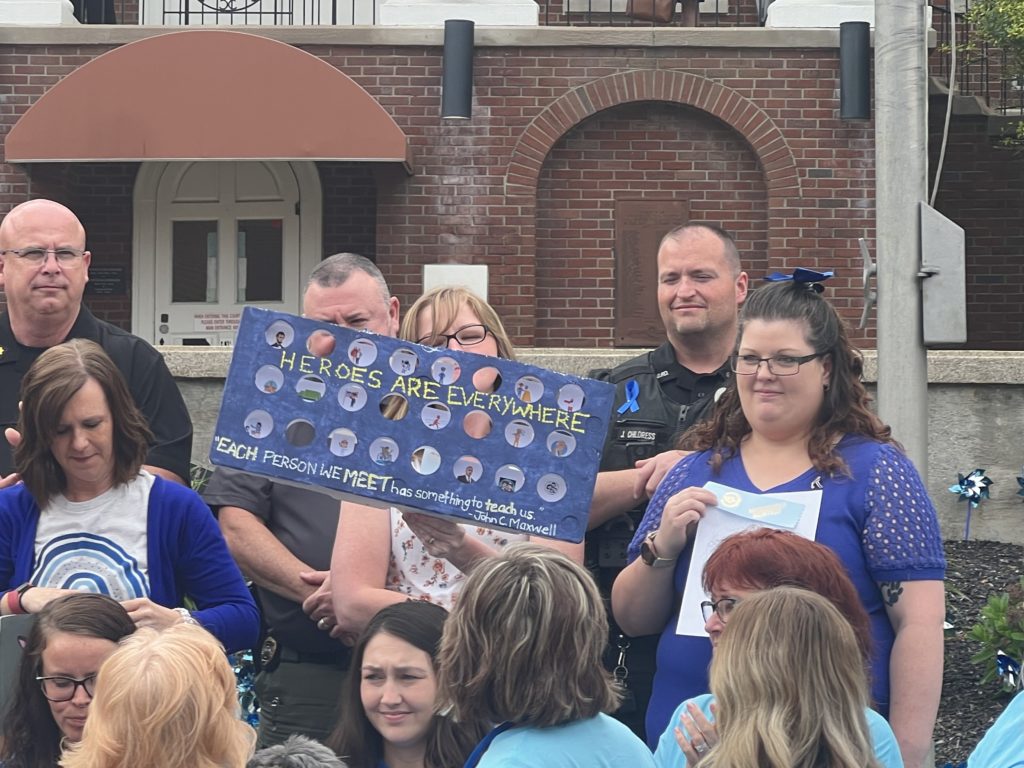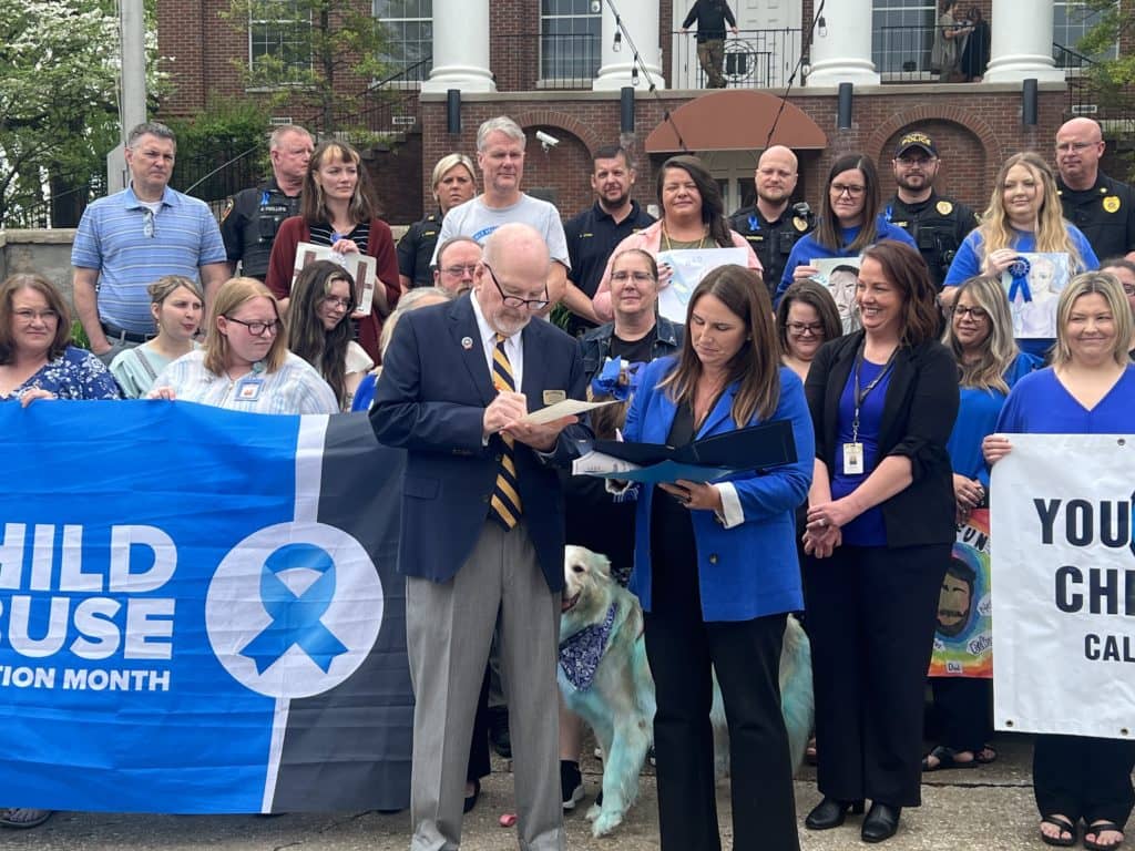 Glasgow, KY – Community leaders and volunteers united on the courthouse steps Tuesday to celebrate Child Abuse Prevention month. Family Court judge Mica Pence and social workers in the county organized the event. Glasgow Mayor Henry Royse and Barren County Judge-Executive Jamie Bewley Byrd signed the proclamation for the awareness of child abuse; an issue Judge Pence has to deal with in her court on a daily basis.