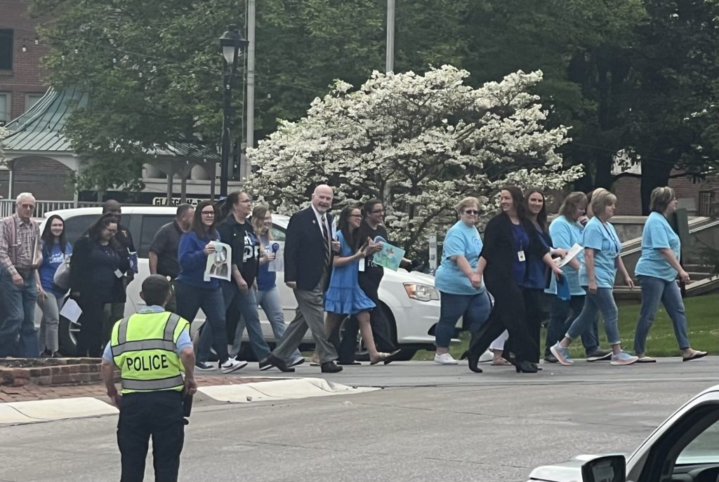 An art contest was held for local students. The theme of the contest was “My Hero” where the children were asked to draw a picture explaining who their hero was. Pence thanked all the participants and read the winners and honorable mentions to a large crowd of people gathered and dressed in blue. Even a furry canine friend had blue hair to show awareness to child abuse prevention.
