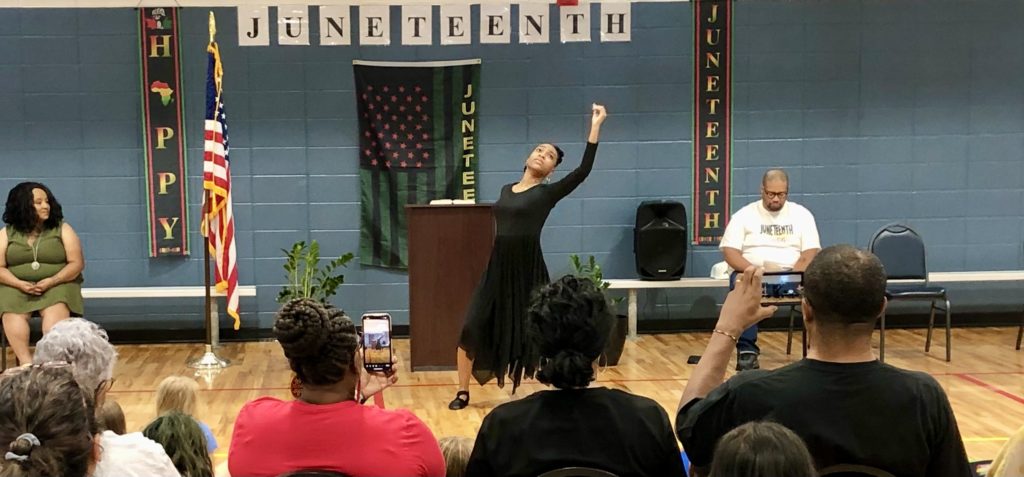 The next speaker was Akaisha Hayes, a young woman who gave the audience a youth’s perspective on Juneteenth. Speaking to the crowd, many of whom were around her age, Hayes delivered a powerful message on the importance of learning history, as to better know oneself.