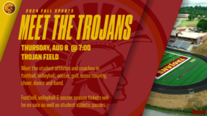 Meet the Trojans for fall sports will be held this Thursday, August 8 at 7:00PM at the football stadium. Meet the student athletes & coaches for football, volleyball, soccer, golf, cross country, cheer, dance & band. Football, volleyball and soccer season tickets will be on sale as well as student athletic passes.