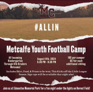 This Thursday, August 8 from 5:30 to 8:30 p.m., all incoming Kindergarten – 6th graders are invited to the Edmonton Memorial Park on the Hornets’ field to kick off little league football season.