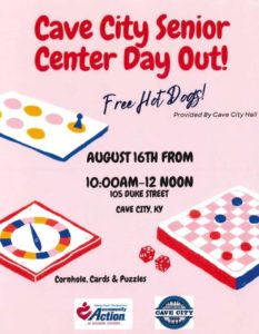 Aug. 16 from 10:0 a.m. – noon is Cave City Senior Center Day Out. This gathering will take place at 105 Duke St. in Cave City. There will be corn hole, cards and puzzles. Cave City’s City Hall is providing free hotdogs.