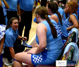 Glasgow girls’ basketball coach Kelsey Kirkpatrick talks to her players during a timeout against Greenwood. The Lady Scotties lost, 38-31. John Brown/WCLU Sports