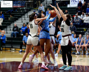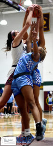 Glasgow’s Cynthia Austin and NaTaya Lightfoot battles for a rebound against Greenwood. The Lady Scotties lost, 38-31. John Brown/WCLU Sports