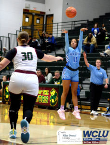 Glasgow’s Jordy Goodman shoots a 3-pointer against Greenwood. The Lady Scotties lost, 38-31. John Brown/WCLU Sports