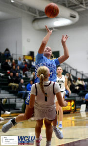 Glasgow’s Riley Strode attempts a shot in the lane against Greenwood. The Lady Scotties lost, 38-31. John Brown/WCLU Sports