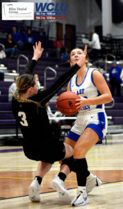 Glasgow’s Karli Hagan gets called for a charge while driving into the lane against South Warren. Glasgow won, 30-25. John Brown/WCLU Sports