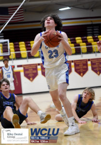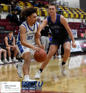 Glasgow’s Colby Brewster drives against Clinton County. The Scotties lost, 67-35. James Brown/WCLU Sports