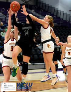 Barren County’s Addy Slagle and Riley Wilson contest a shot in the lane against Cumberland County. The Trojanettes won, 50-28. John Brown/WCLU Sports