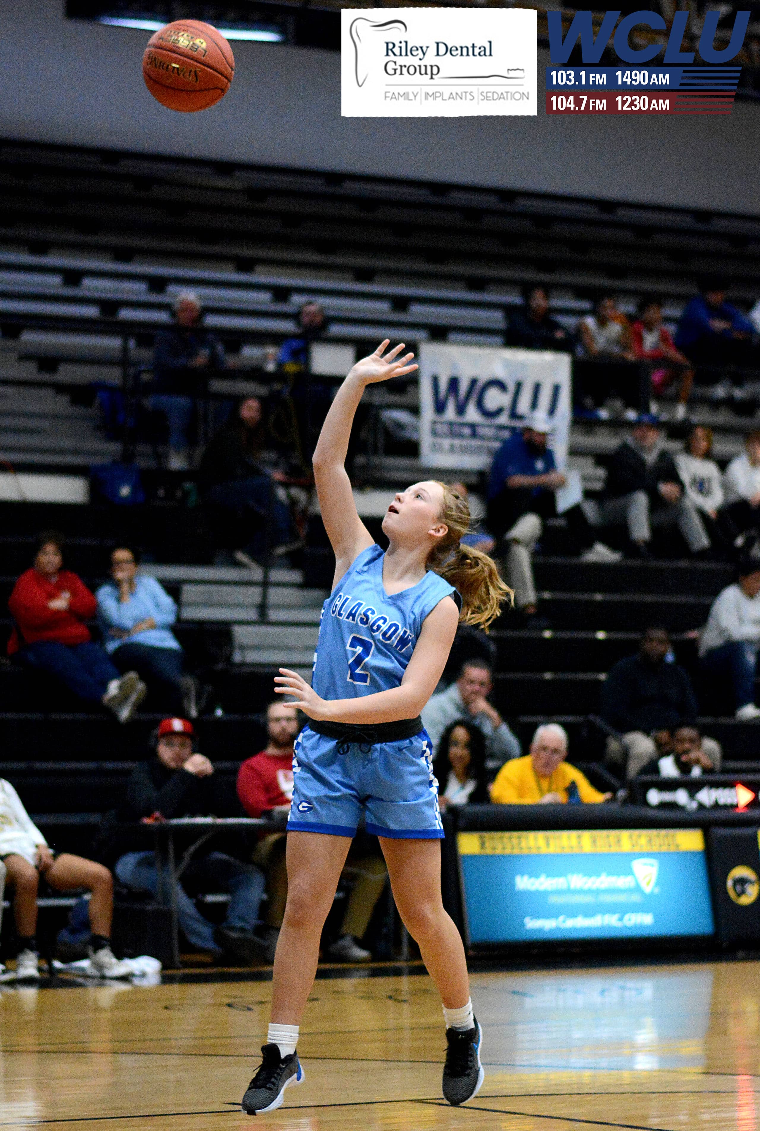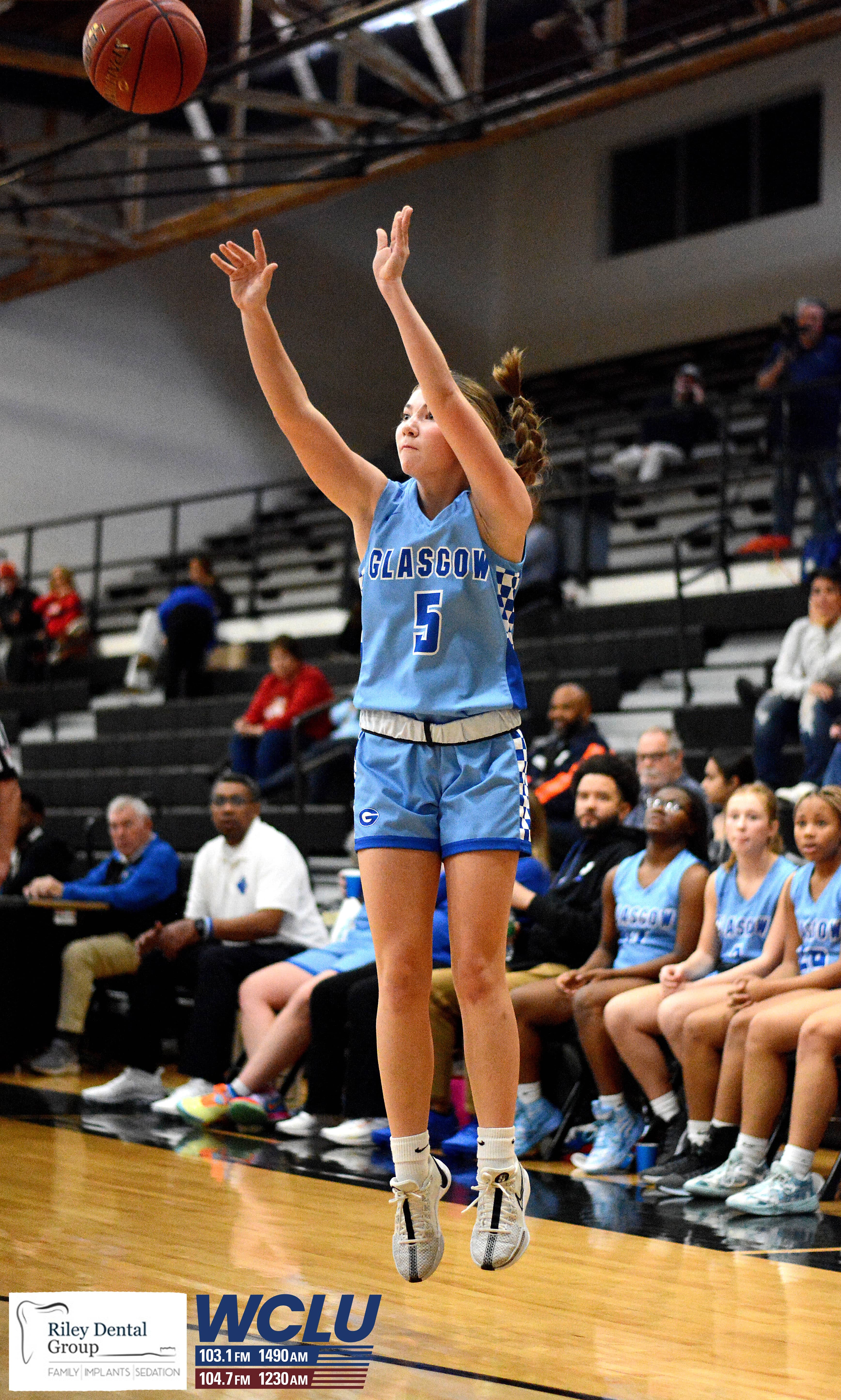 Glasgow’s Kerigan Hagan shoots a 3-pointer against Russellville. Glasgow won, 56-35. John Brown/WCLU Sports