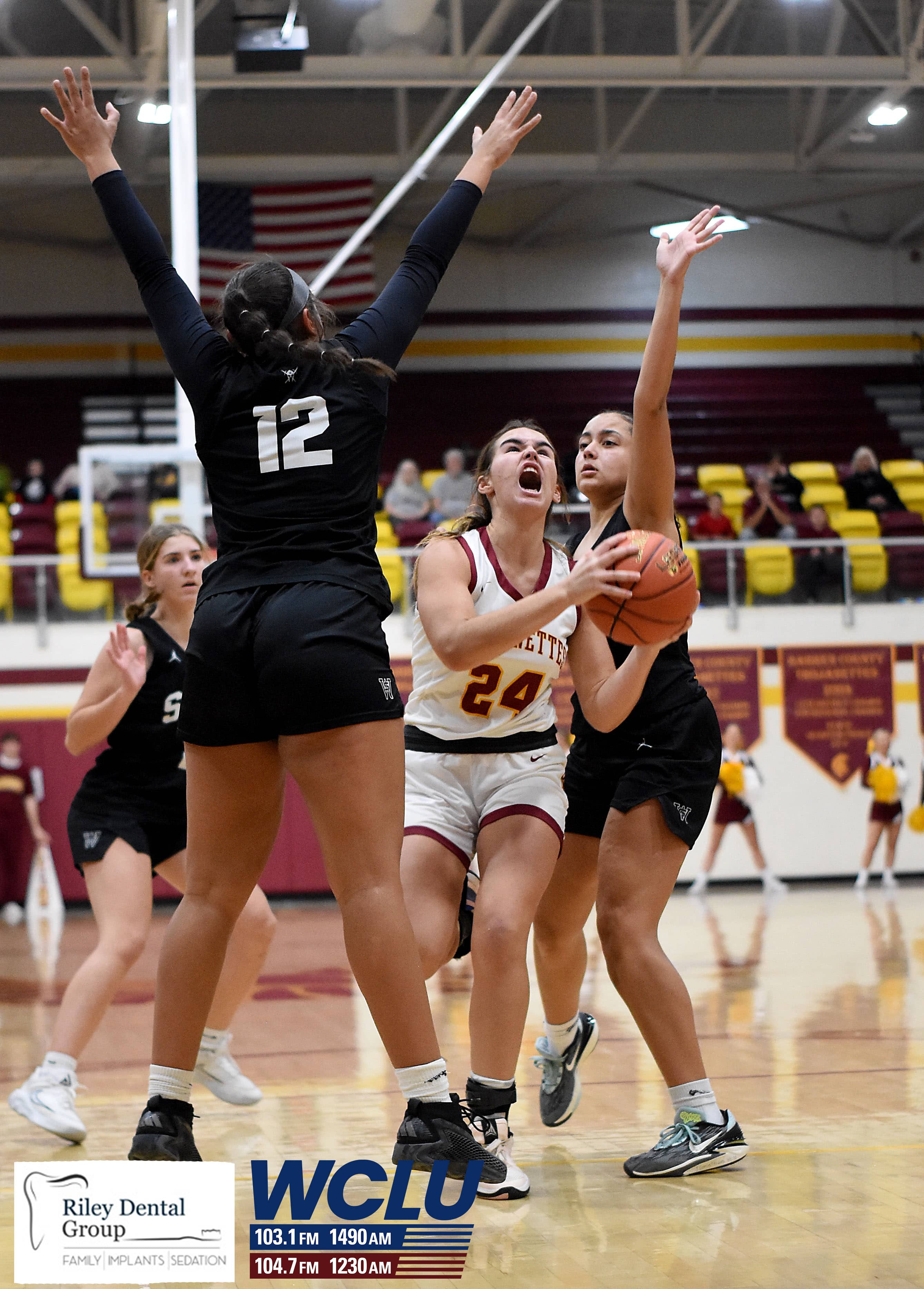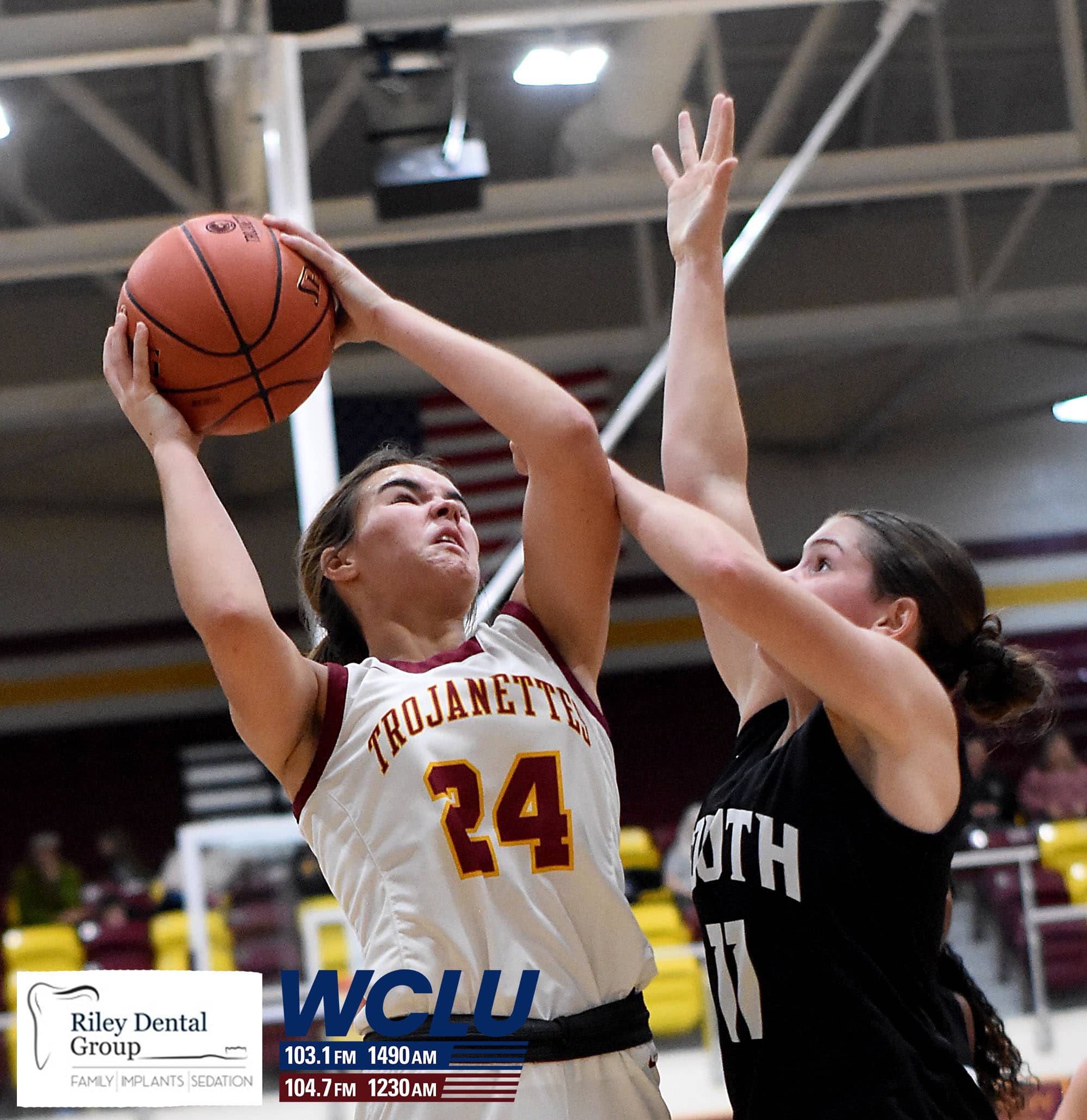Barren County’s Shelby Byrd is fouled as shoots in the lane against South Warren on Homecoming night. The Trojanettes won, 49-38. James Brown/WCLU Sports