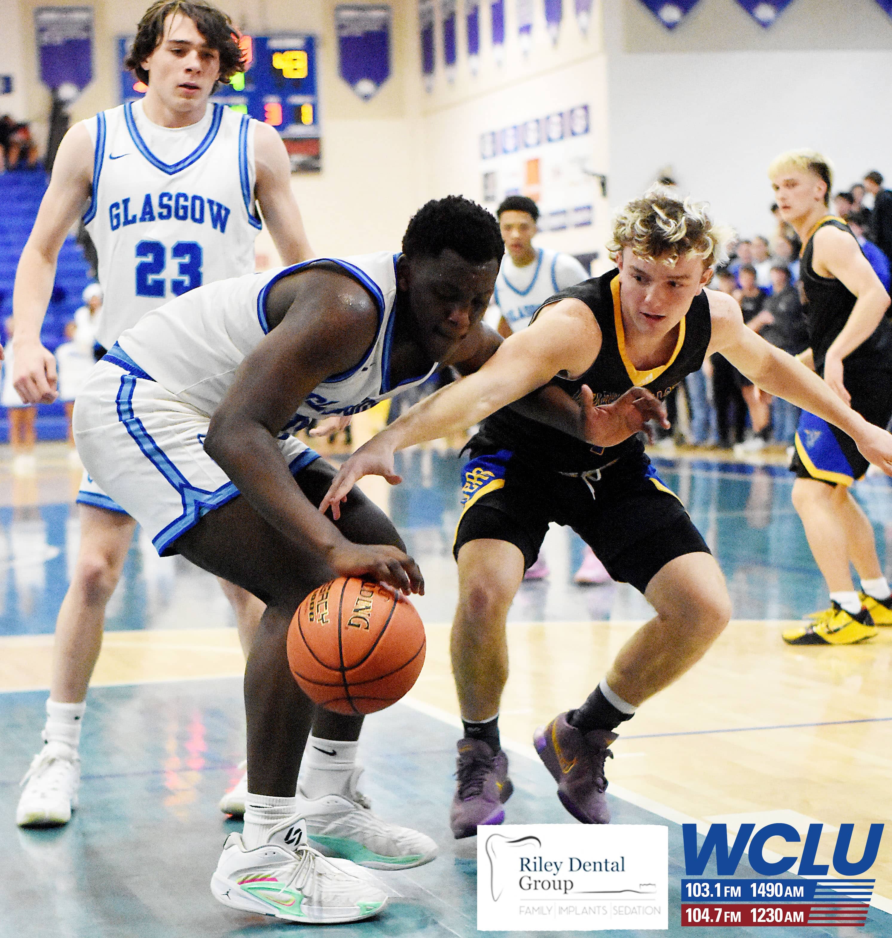 Glasgow’s Jeremiah Driver battles for a loose ball against Warren East in a 15th District contest. The Scotties won, 75-71, in overtime. James Brown/WCLU Sports