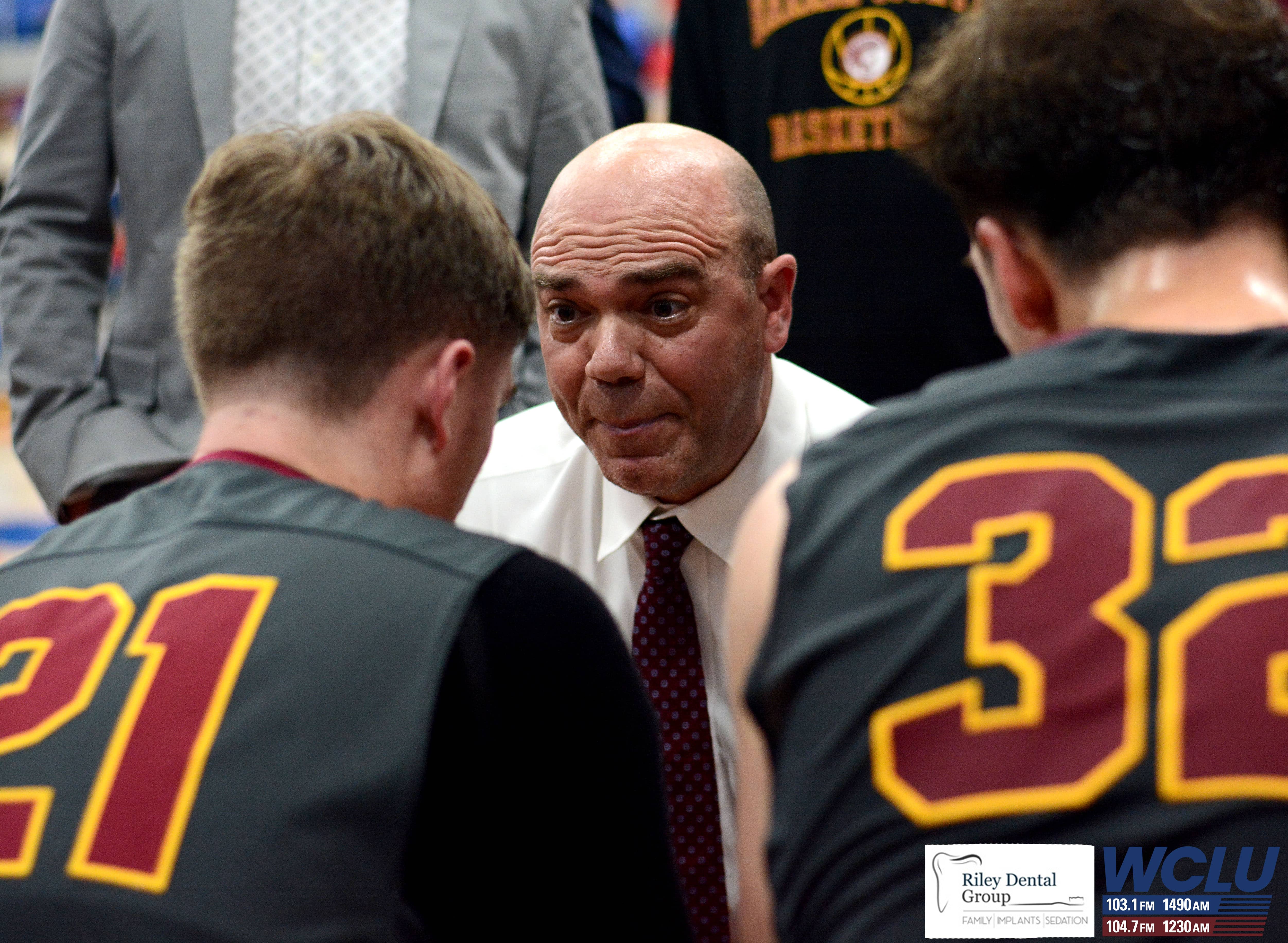 Barren County boys’ basketball coach Warren Cunningham talks with his team during a timeout against Allen County-Scottsville. The Trojans won, 62-48. John Brown/WCLU Sports