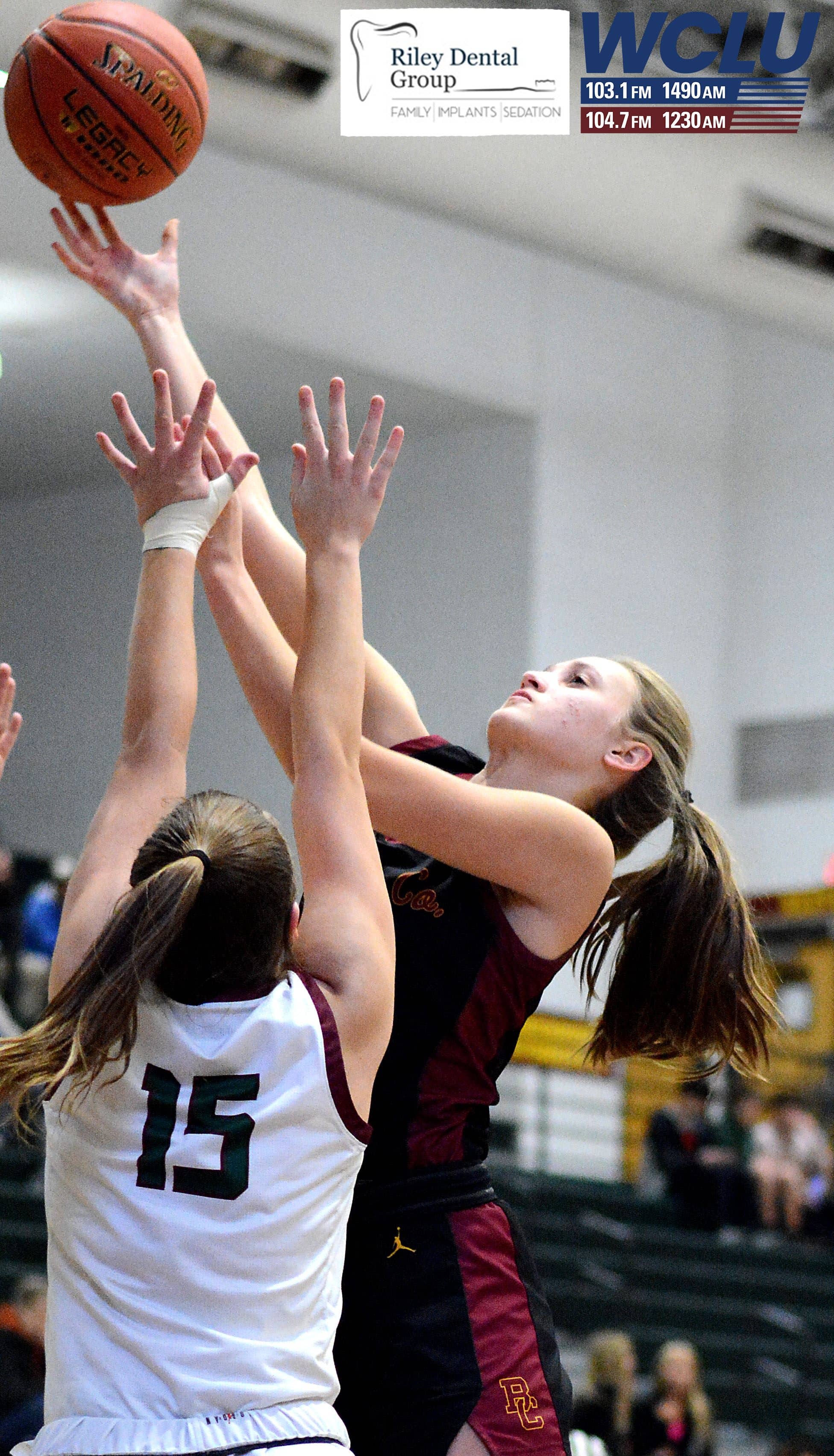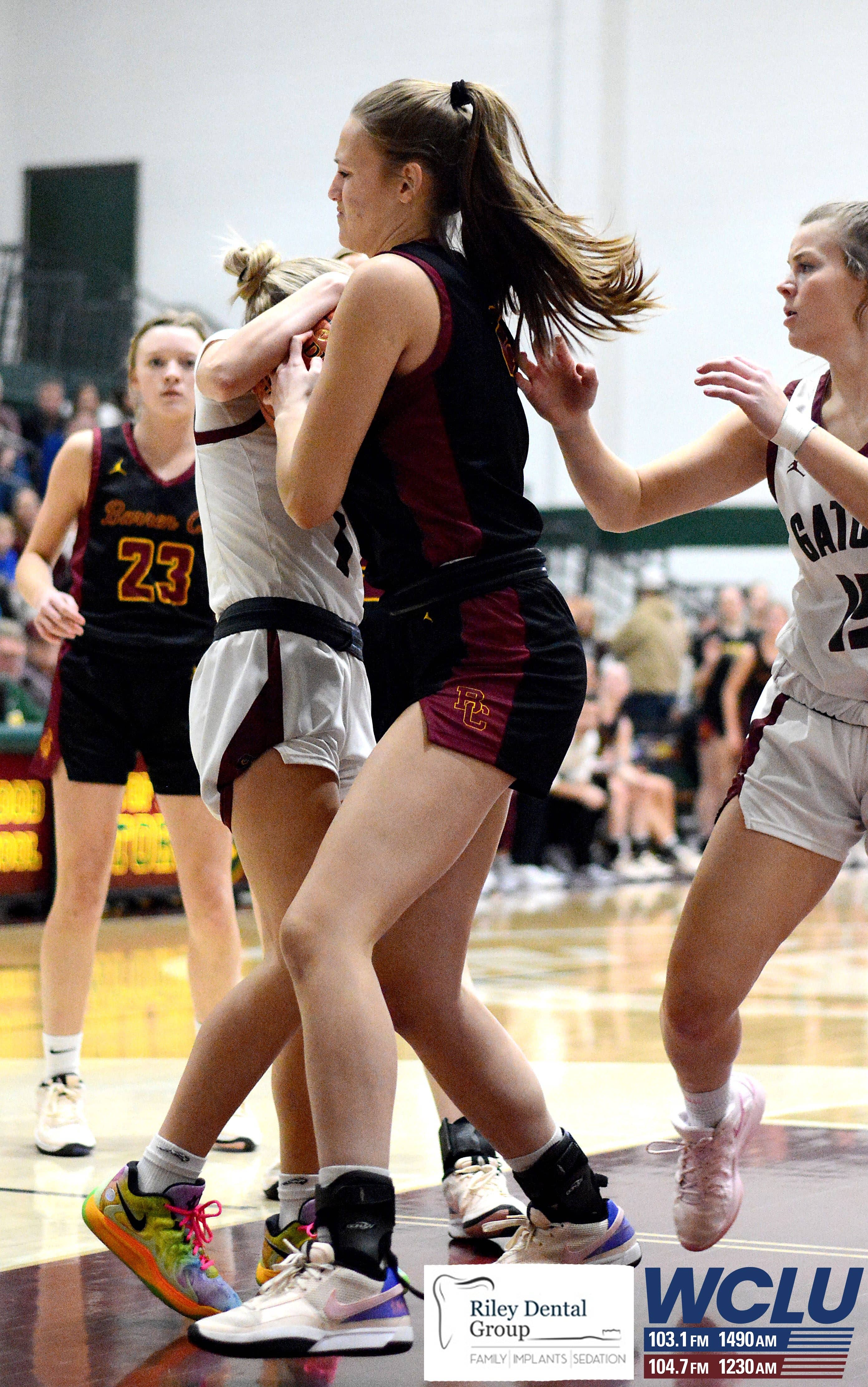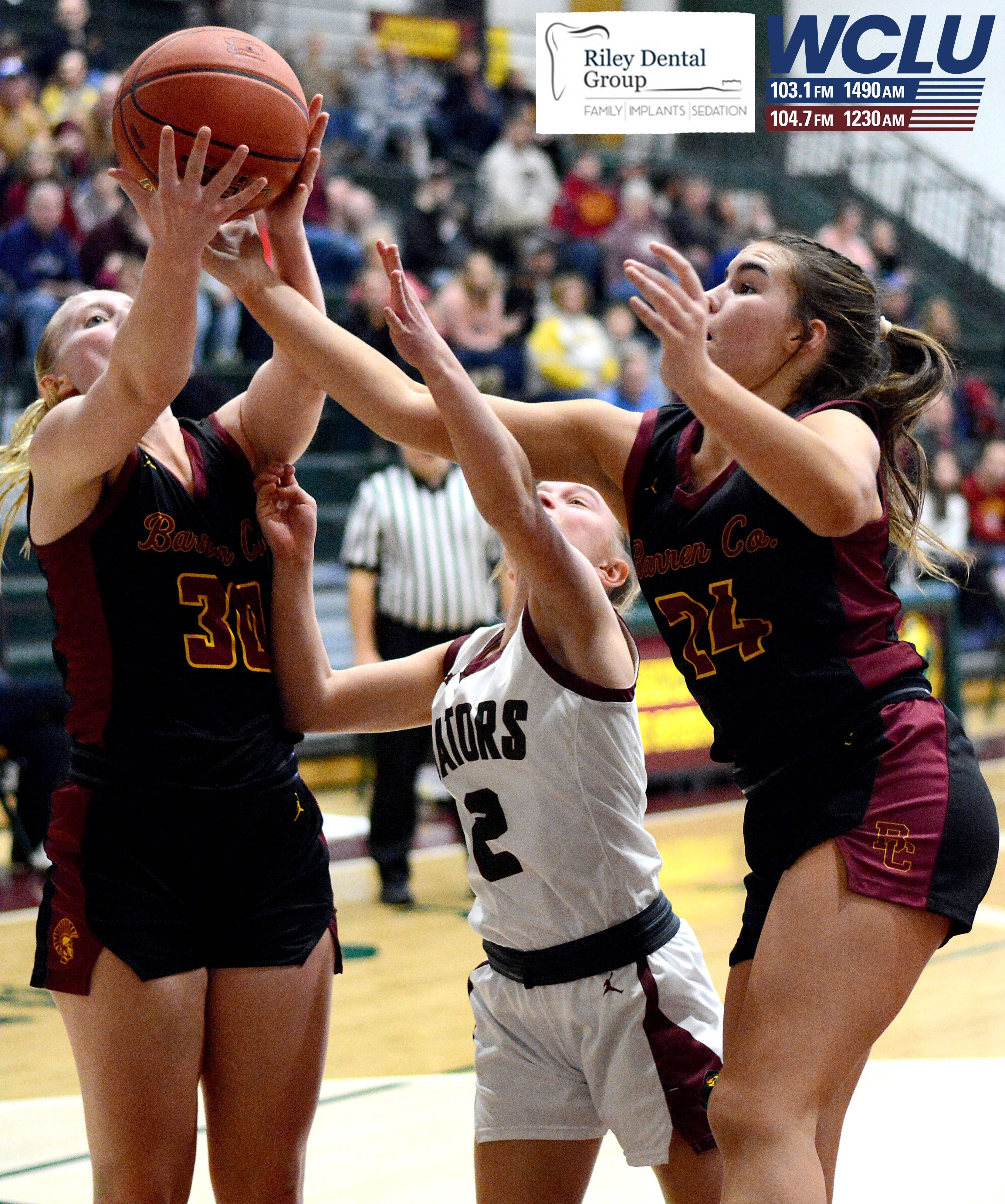 Barren County’s Katie Gearlds and Shelby Byrd battle for a rebound against Greenwood. Barren County won, 60-35. John Brown/WCLU Sports