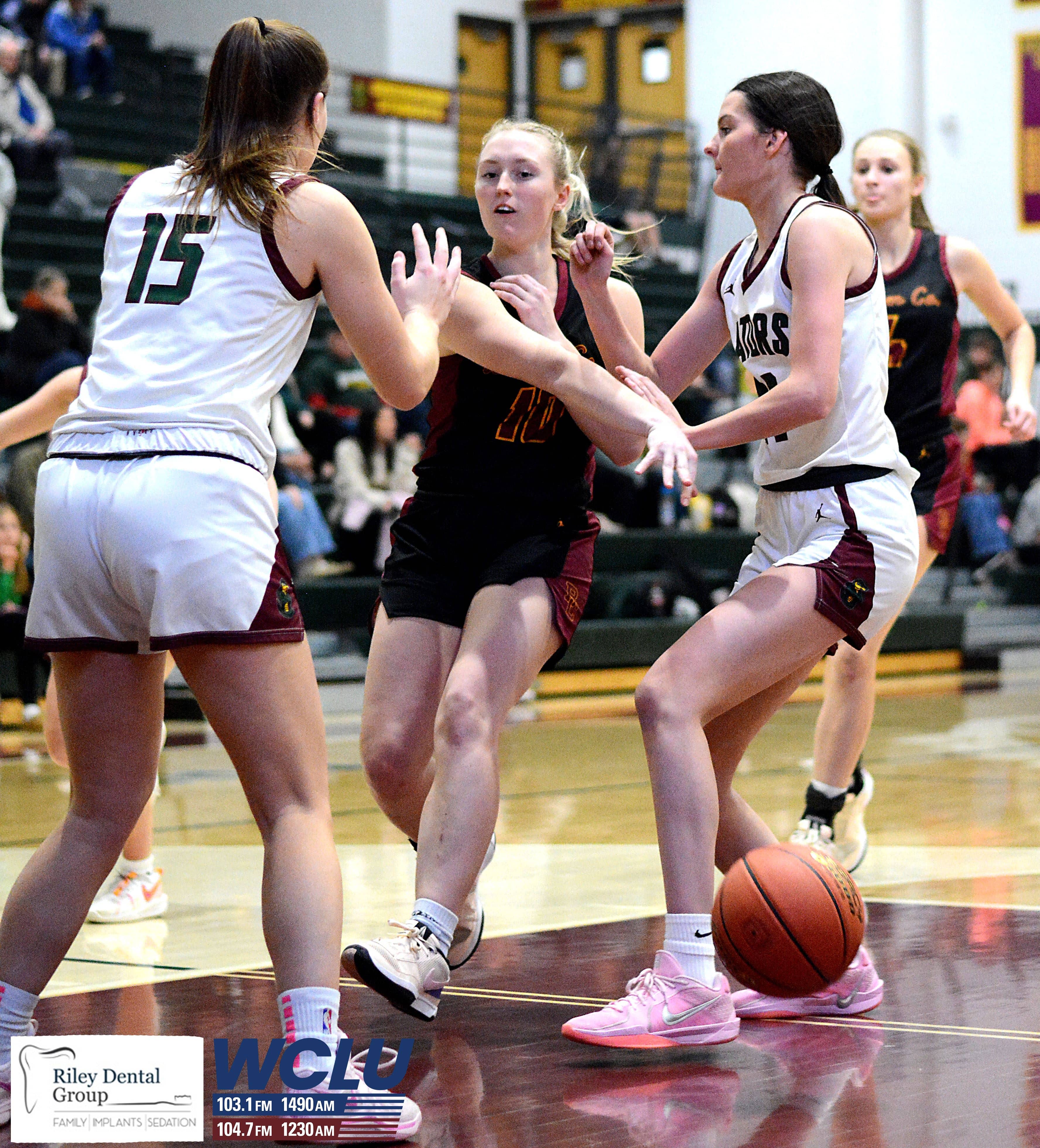 Barren County’s Katie Elmore splits two defenders with a pass against Greenwood. Barren County won, 60-35. John Brown/WCLU Sports