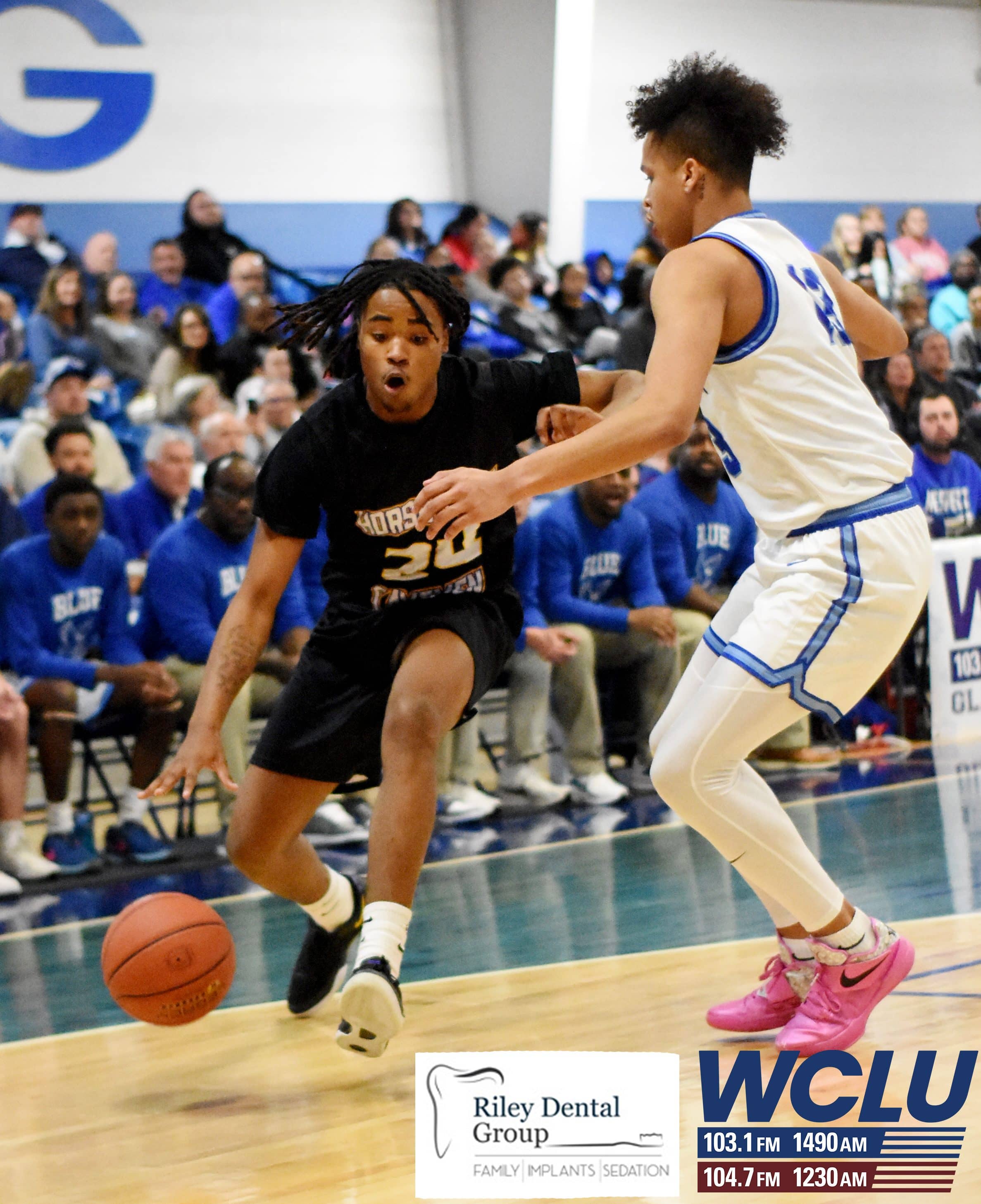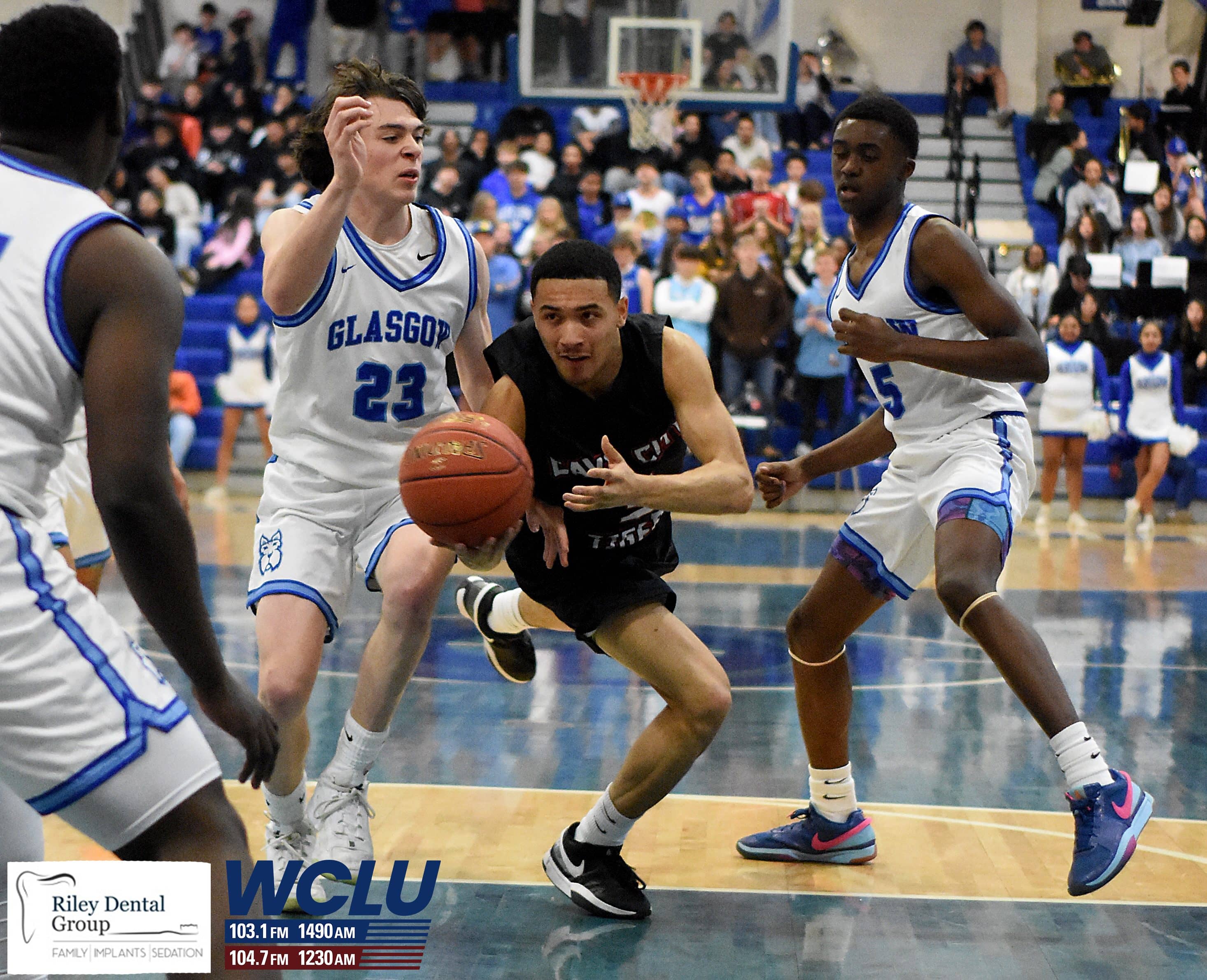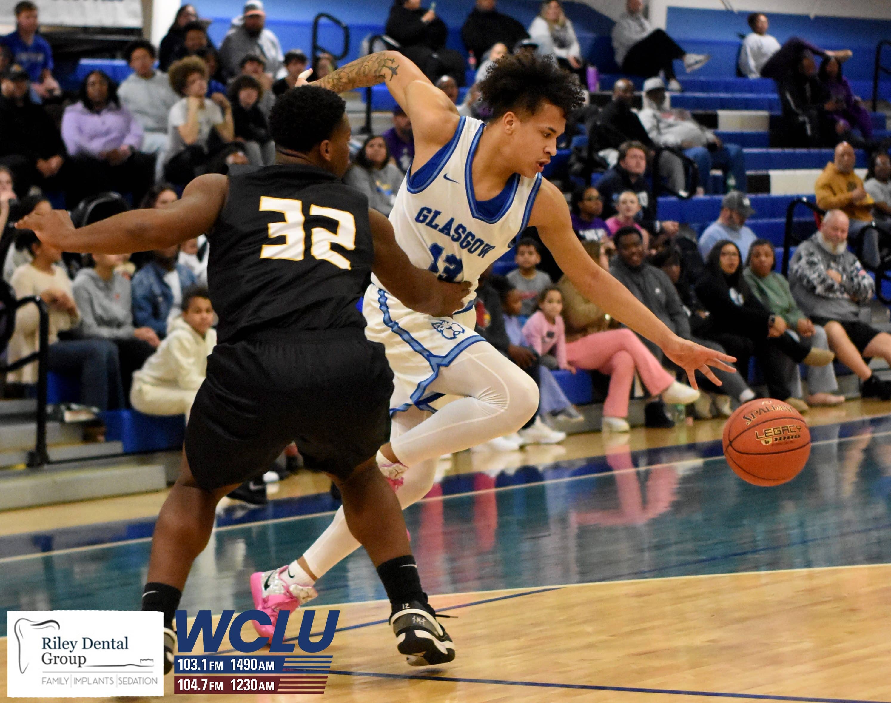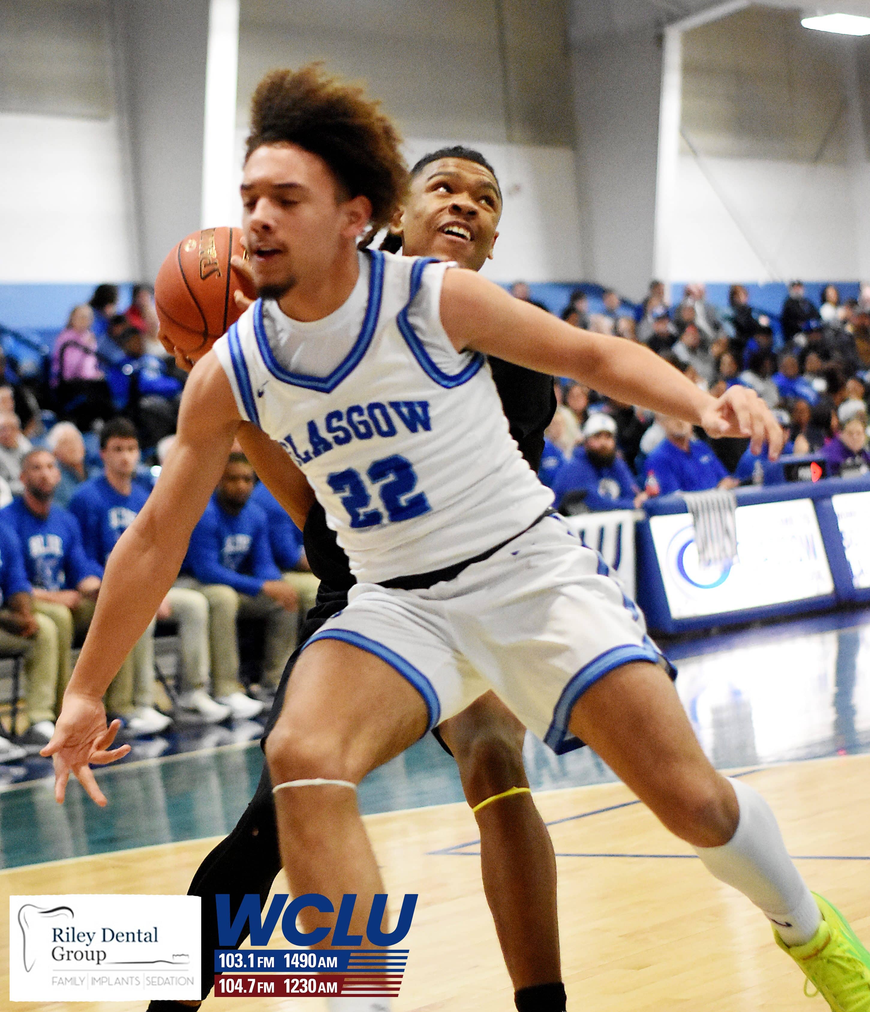 Glasgow’s Jerrick Martin drives as Caverna’s Katavian Fryar defends. The Colonels beat the Scotties, 75-54. James Brown/WCLU Sports