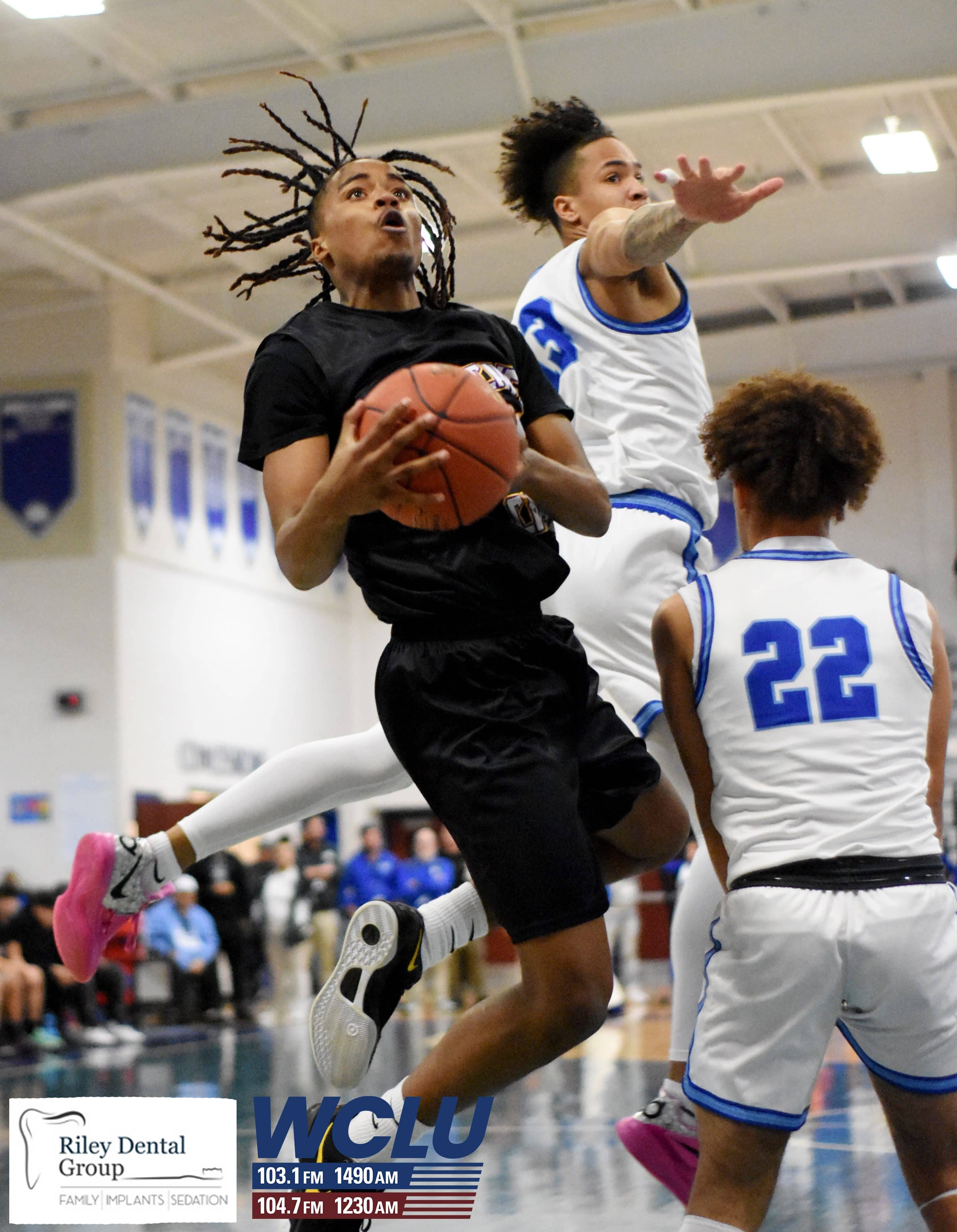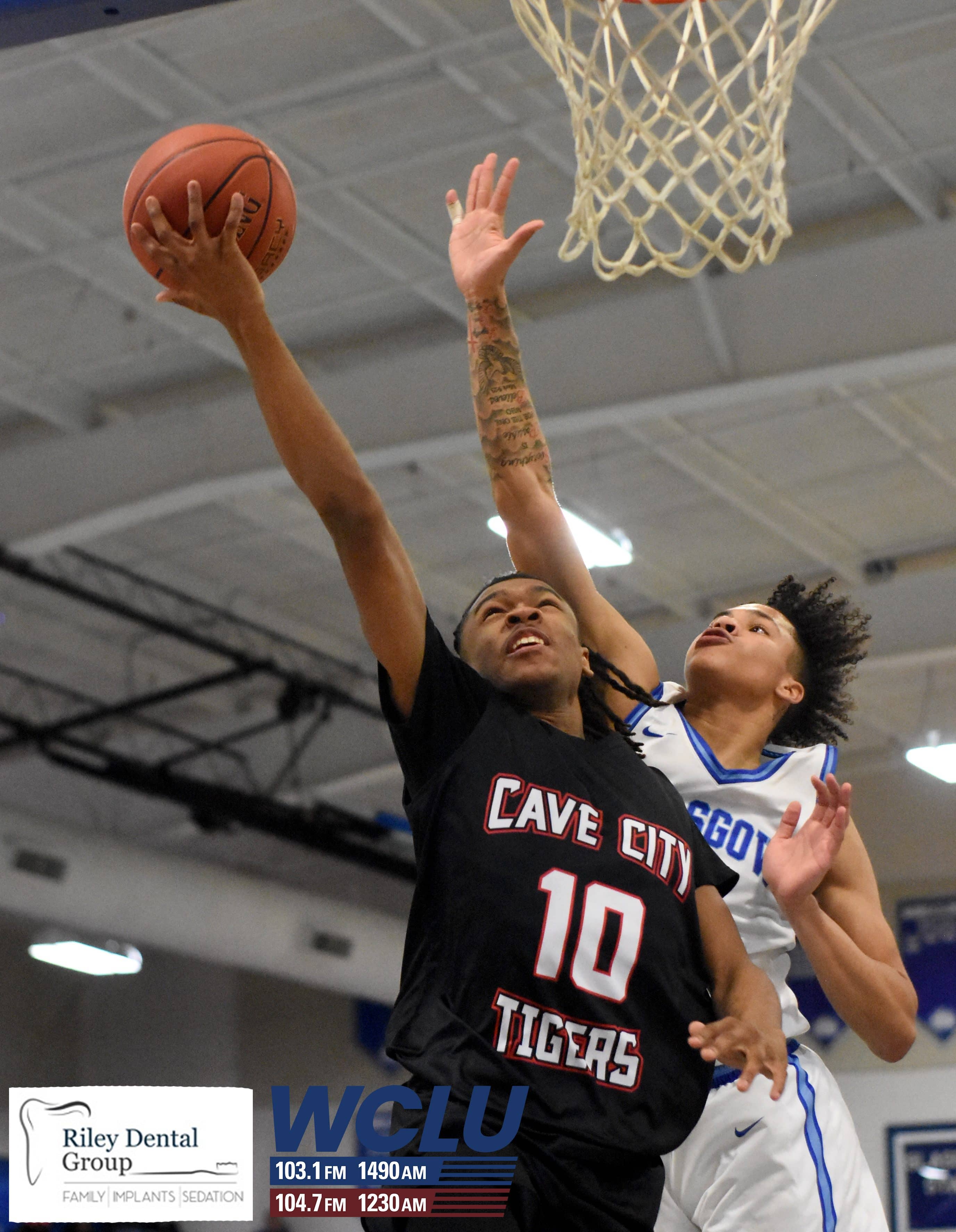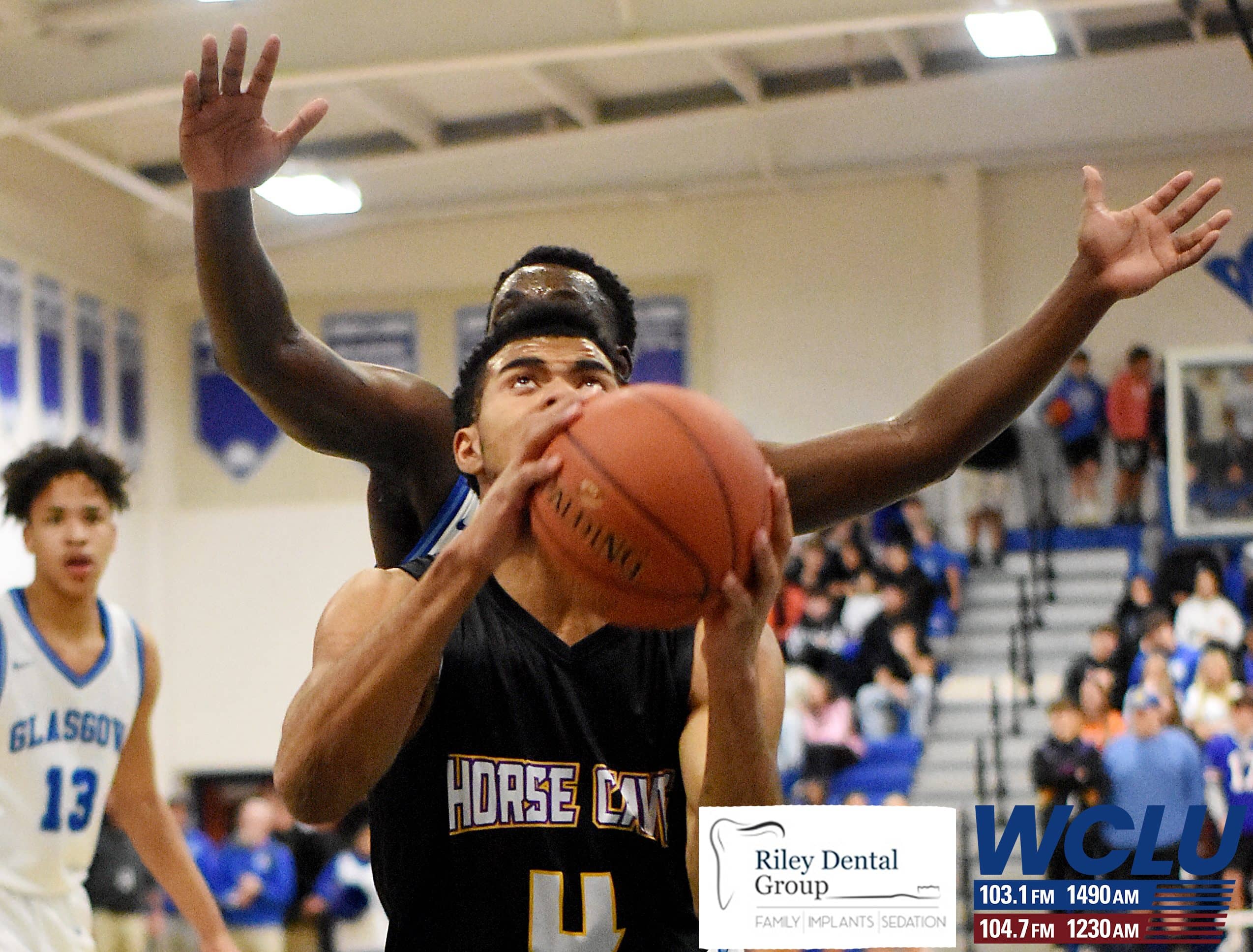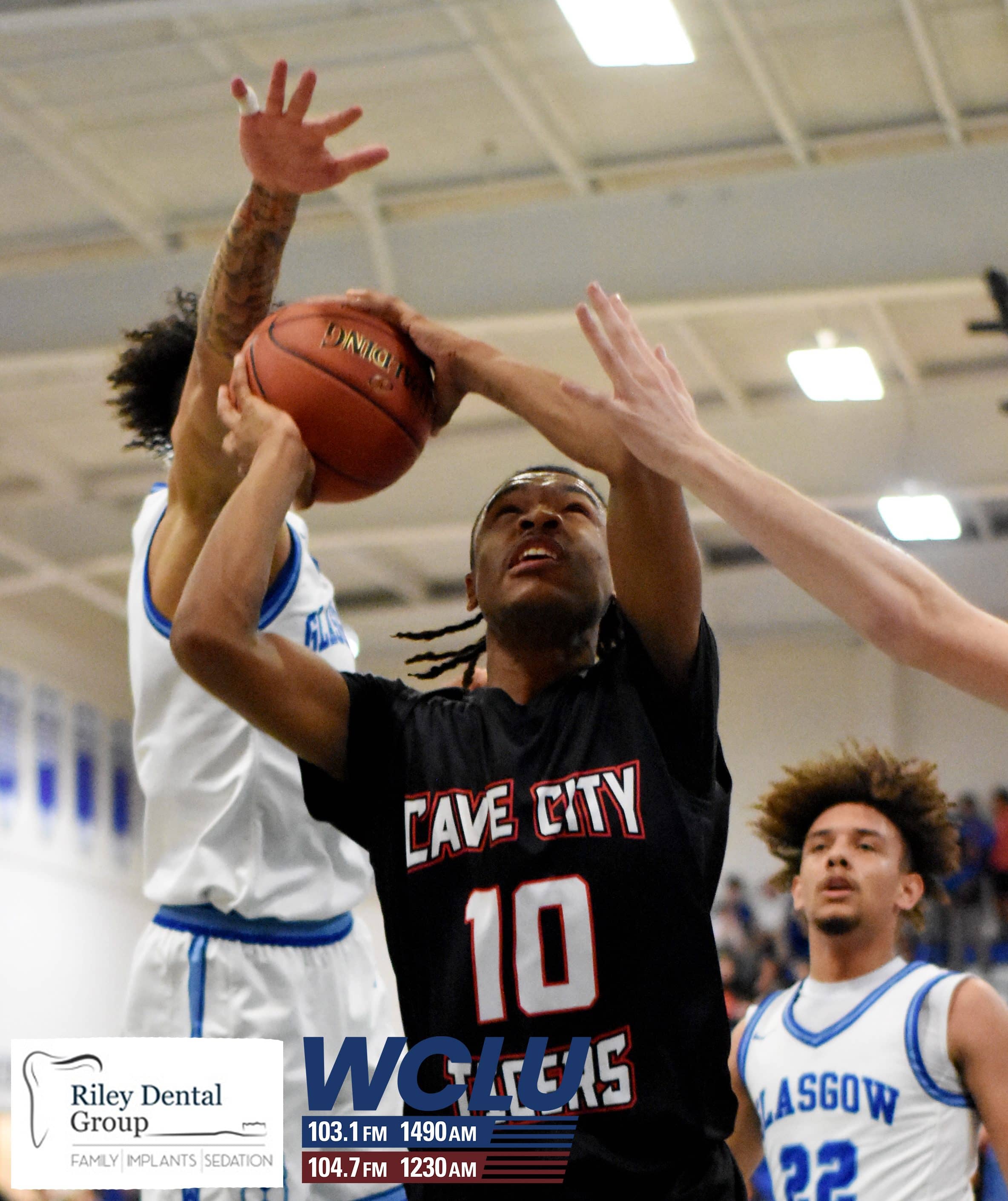 Caverna’s Cortavian Maxey attempts a shot in the lane as Glasgow’s Jerrick Martin defends. The Colonels beat the Scotties, 75-54. James Brown/WCLU Sports