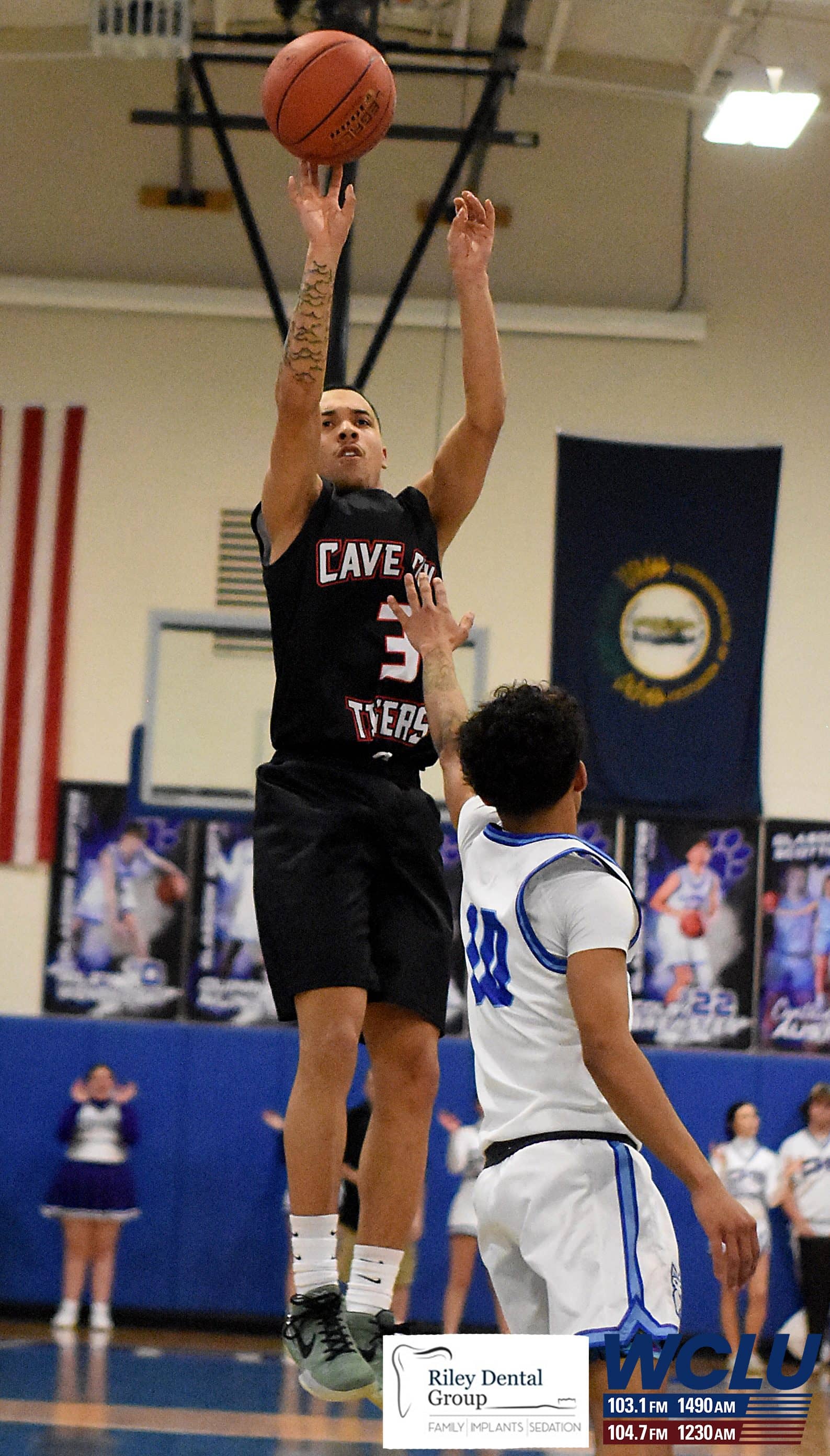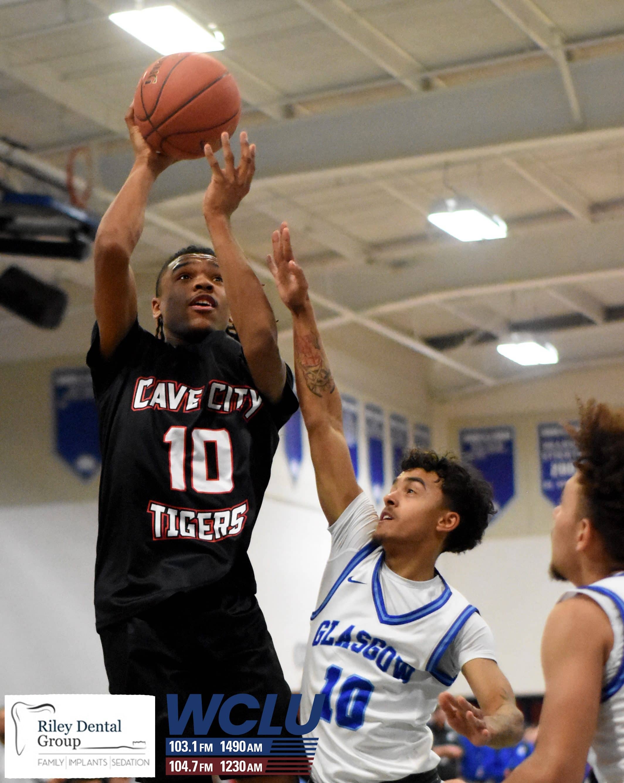 Caverna’s Jaylin Craine shoots a jumper as Glasgow’s Josiah Driver defends. The Colonels beat the Scotties, 75-54. James Brown/WCLU Sports