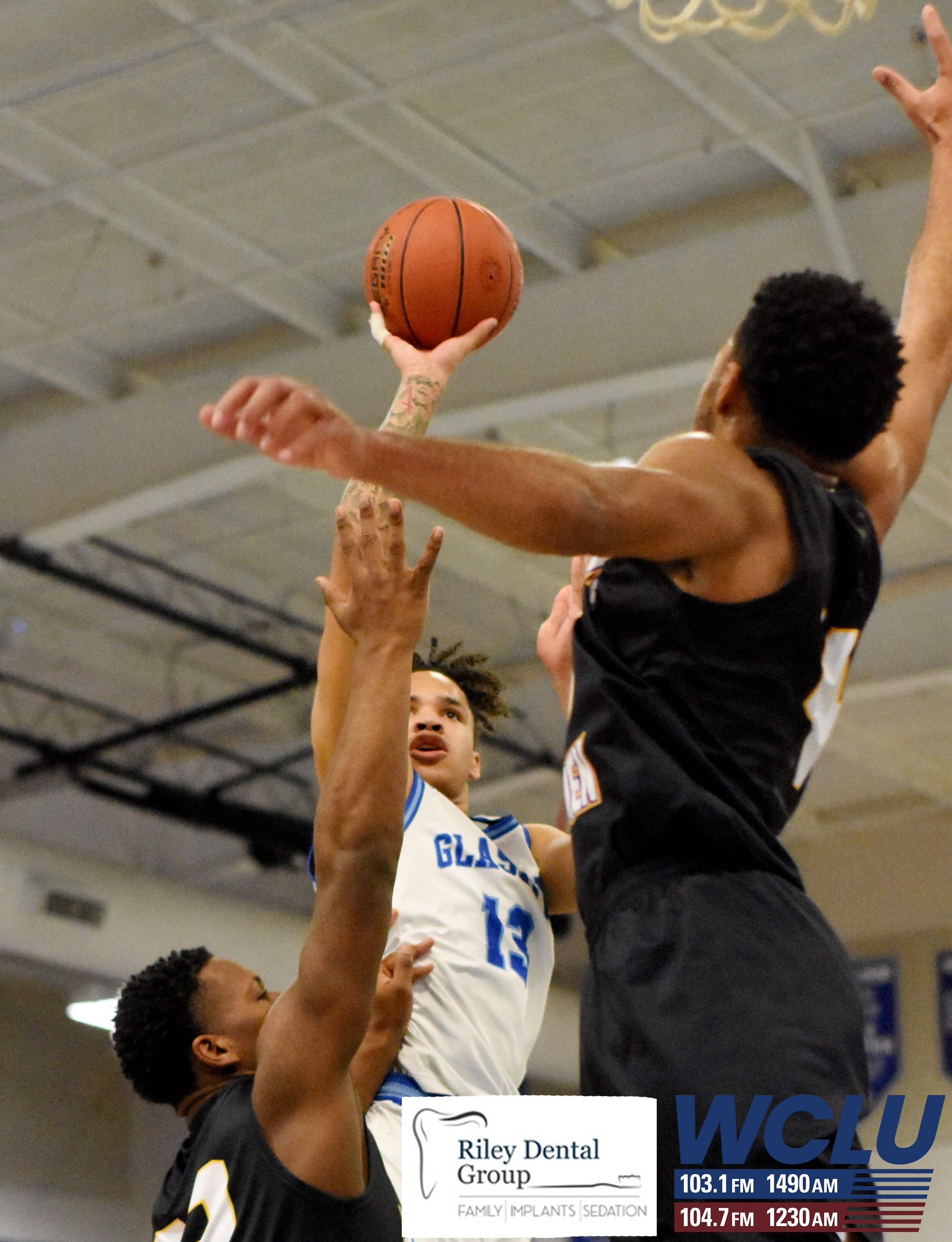 Caverna’s Cortavian Maxey attempts a shot as Glasgow’s Jerrick Martin defends. The Colonels beat the Scotties, 75-54. James Brown/WCLU Sports