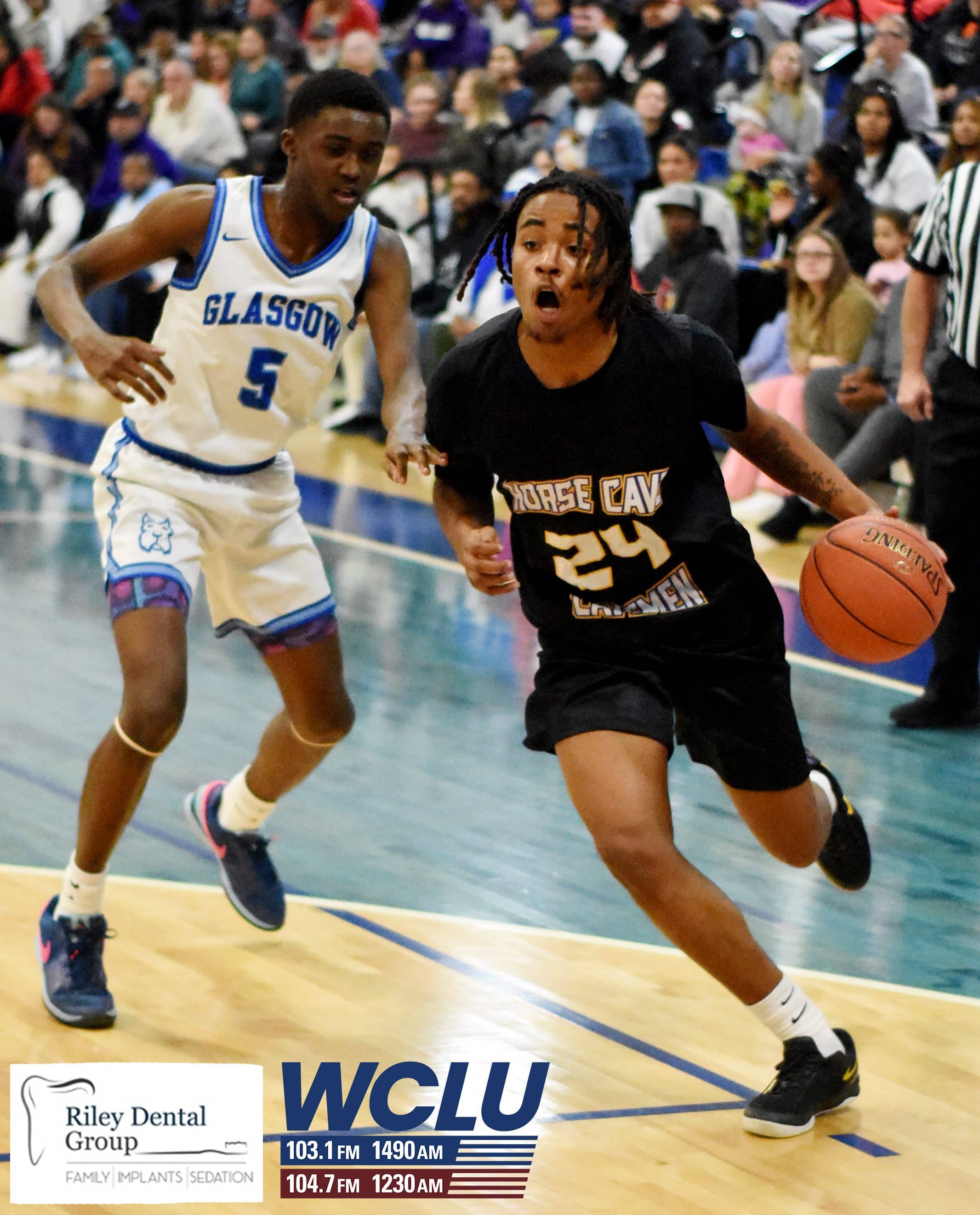 Caverna’s Russell Williams drives as Glasgow’s Jerrick Martin defends. The Colonels beat the Scotties, 75-54. James Brown/WCLU Sports