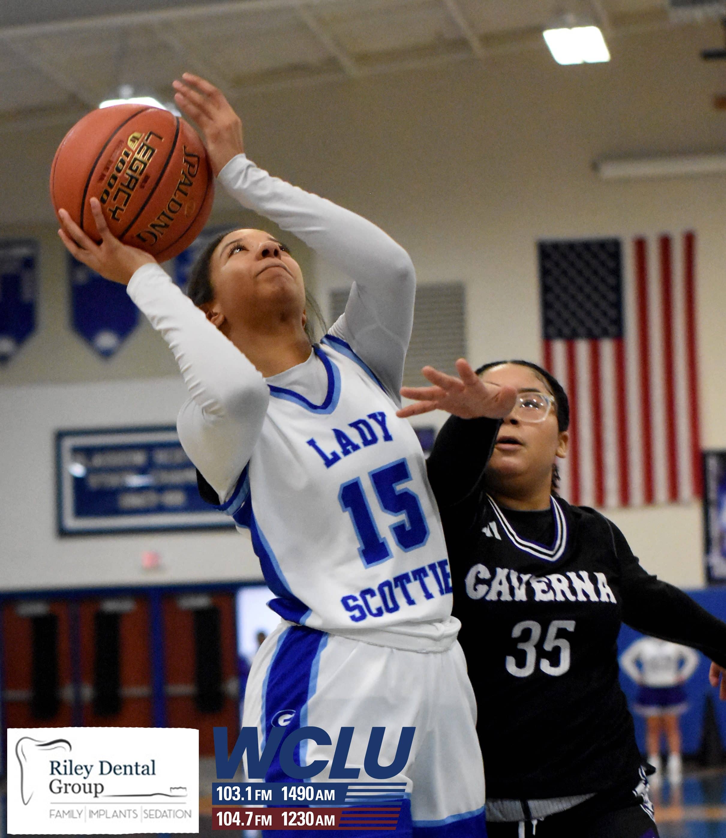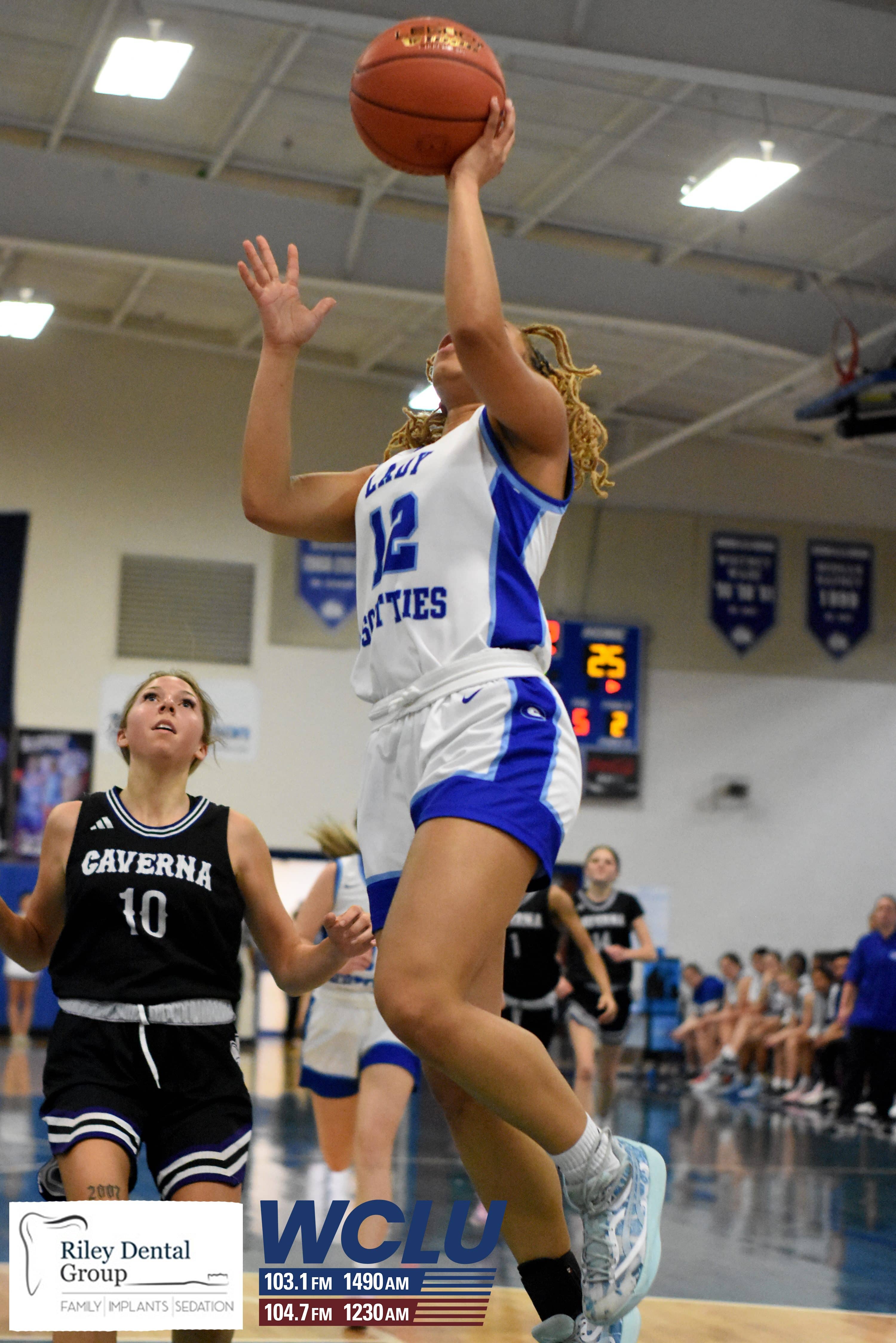 Glasgow’s Cynthia Austin shoots a layup as Caverna’s Morgan Thompson looks on. The Lady Scotties beat the Lady Colonels, 71-35. James Brown/WCLU Sports