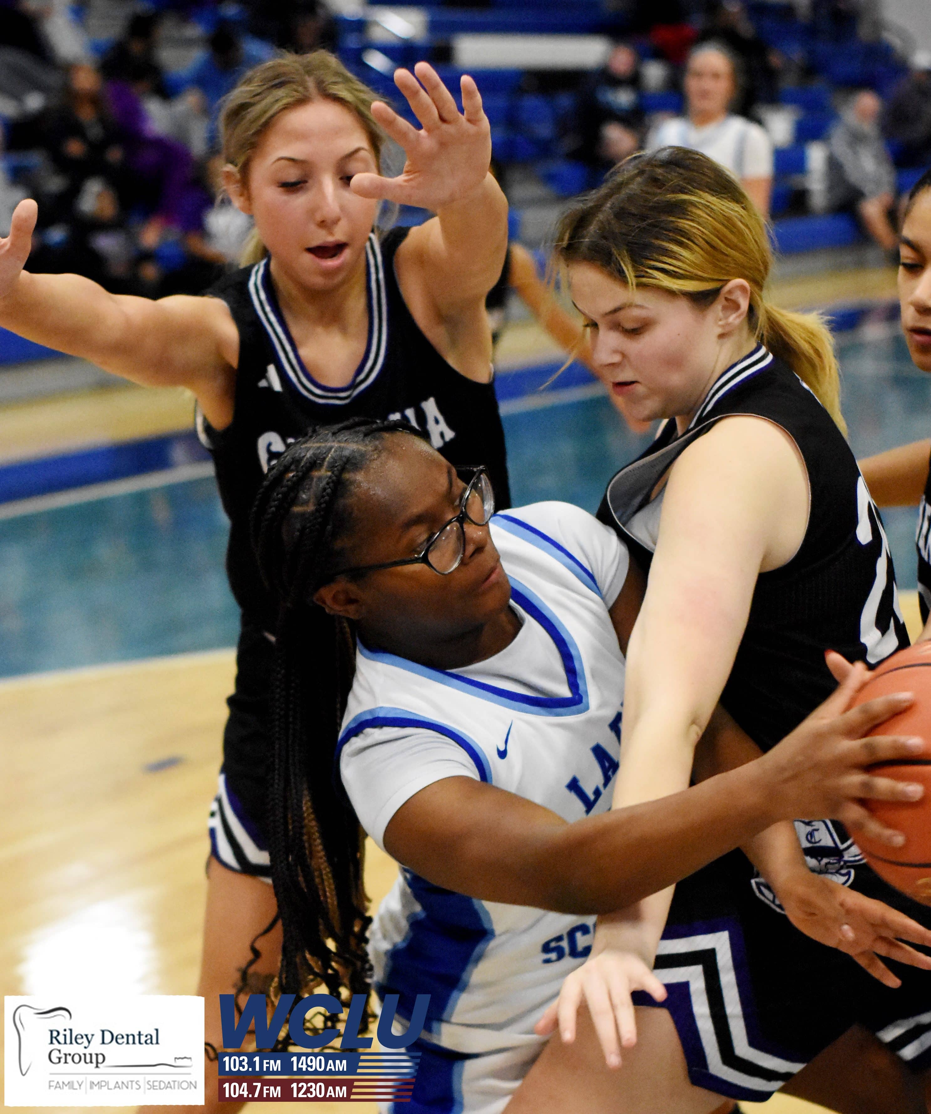 Caverna’s Jakada Thompson and LaDazjah Hamilson and Glasgow’s Jordy Goodman and Addyson Norris battle for the ball. The Lady Scotties beat the Lady Colonels, 71-35. James Brown/WCLU Sports