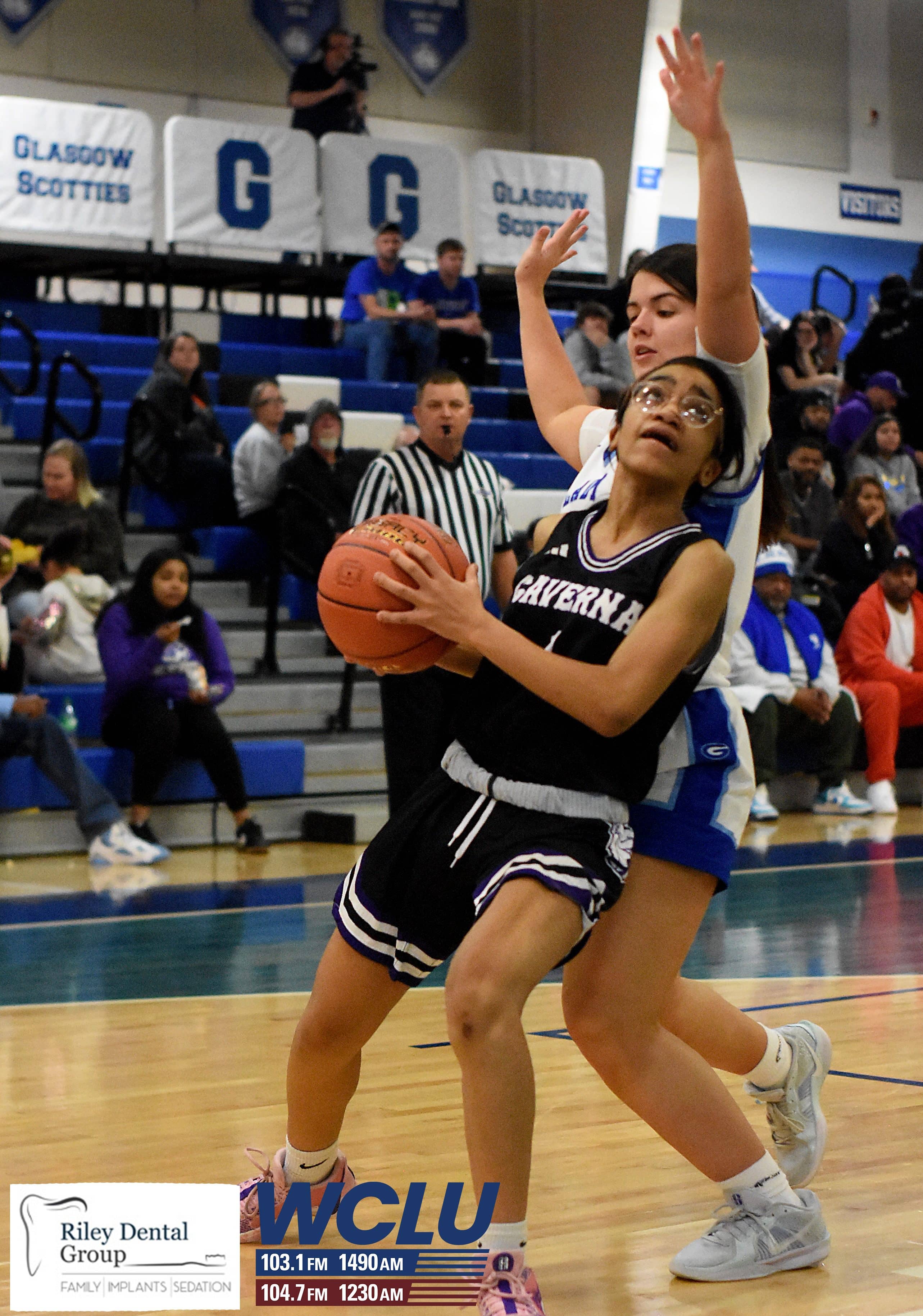 Caverna’s Jordyn Bethel drives as Glasgow’s Karli Hagan defends. The Lady Scotties beat the Lady Colonels, 71-35. James Brown/WCLU Sports