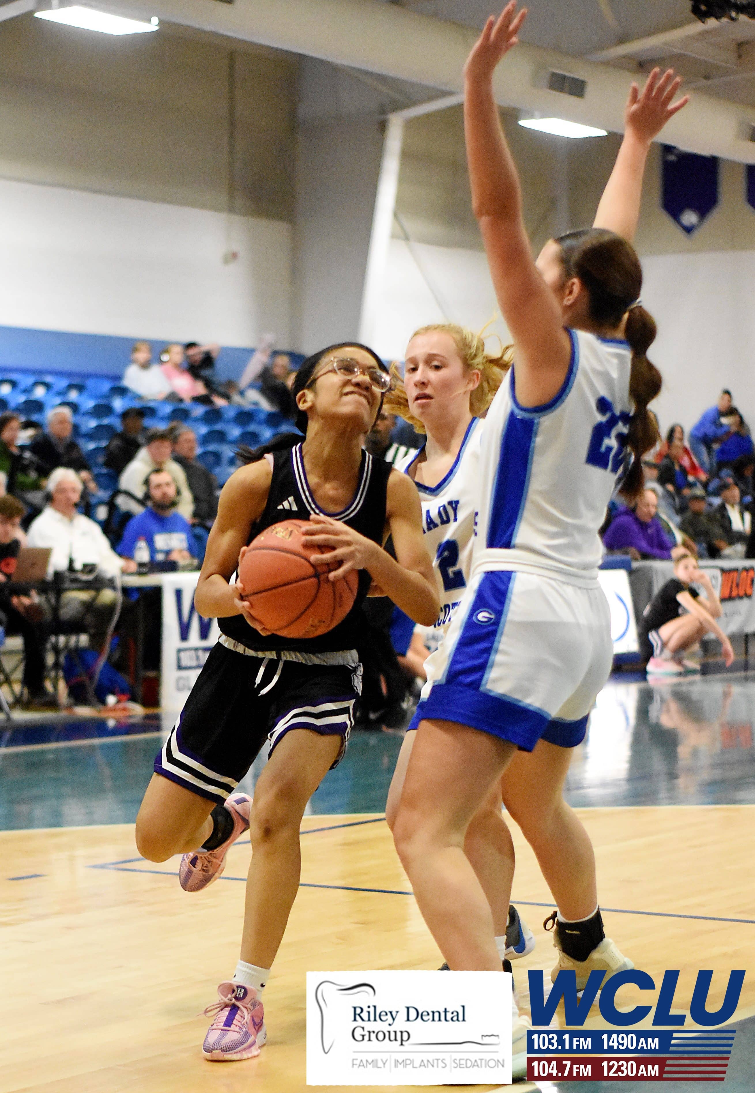 Glasgow’s Kayla Kirkpatrick drives as Caverna’s Jakada Thompson defends. The Lady Scotties beat the Lady Colonels, 71-35. James Brown/WCLU Sports