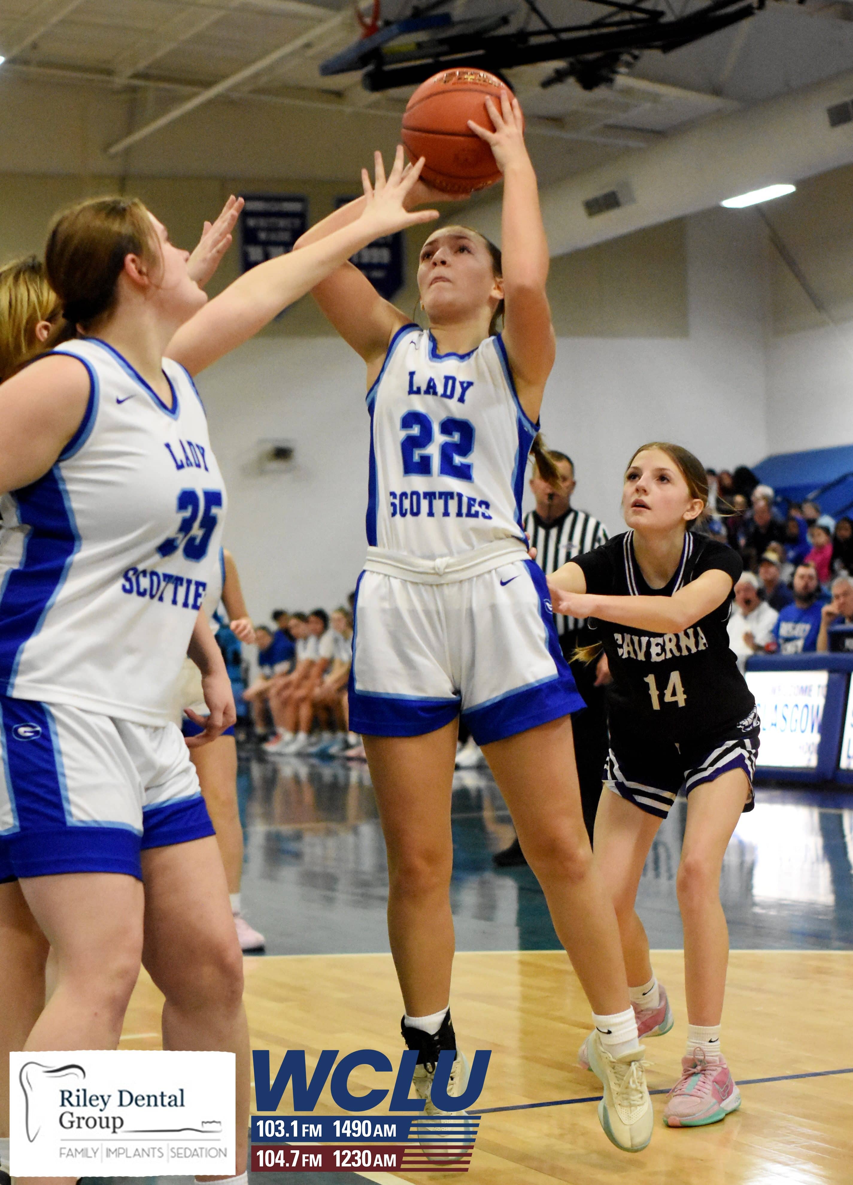 Glasgow’s Karli Hagan shoots a jumper as Caverna’s Kinley Thompson defends. The Lady Scotties beat the Lady Colonels, 71-35. James Brown/WCLU Sports