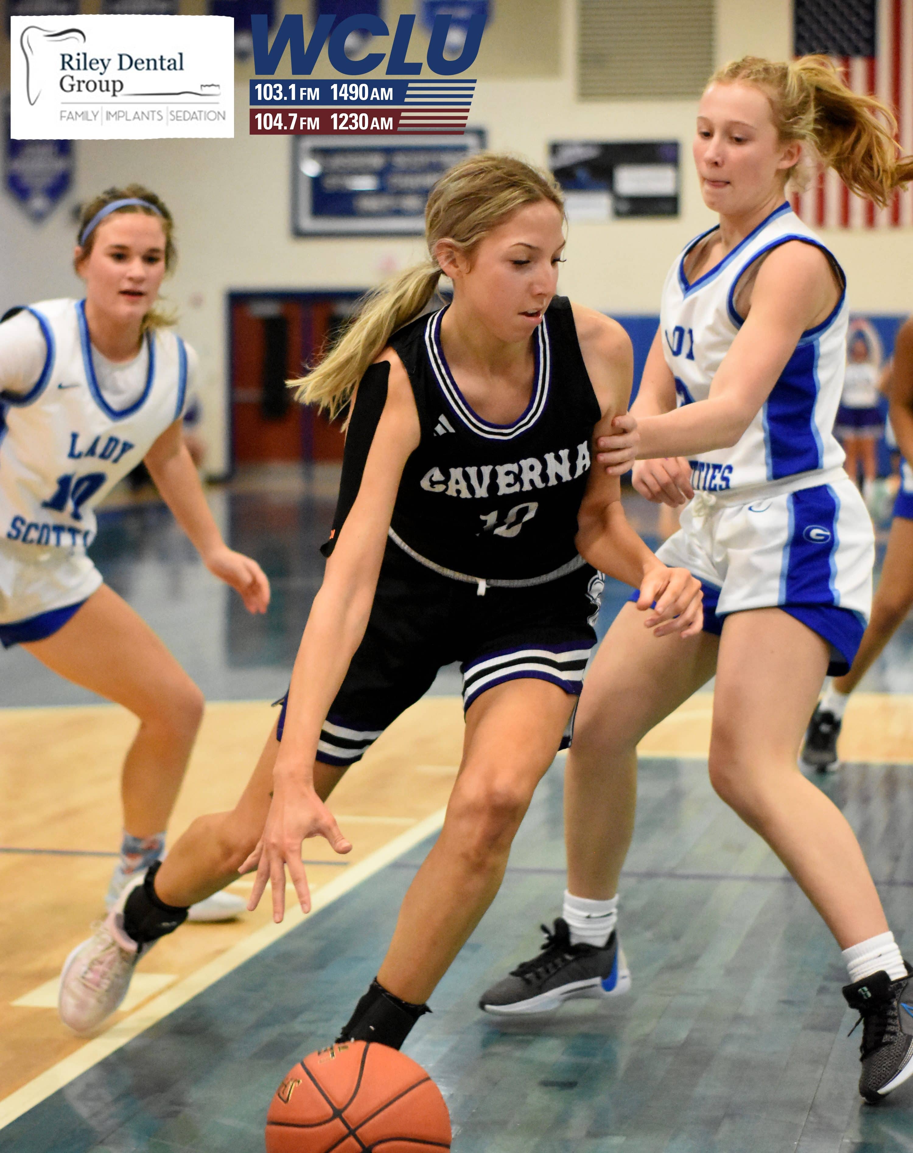 Glasgow’s Jayla Craine passes the ball as Caverna’s Natalie Wells and Morgan Thompson defend. The Lady Scotties beat the Lady Colonels, 71-35. James Brown/WCLU Sports