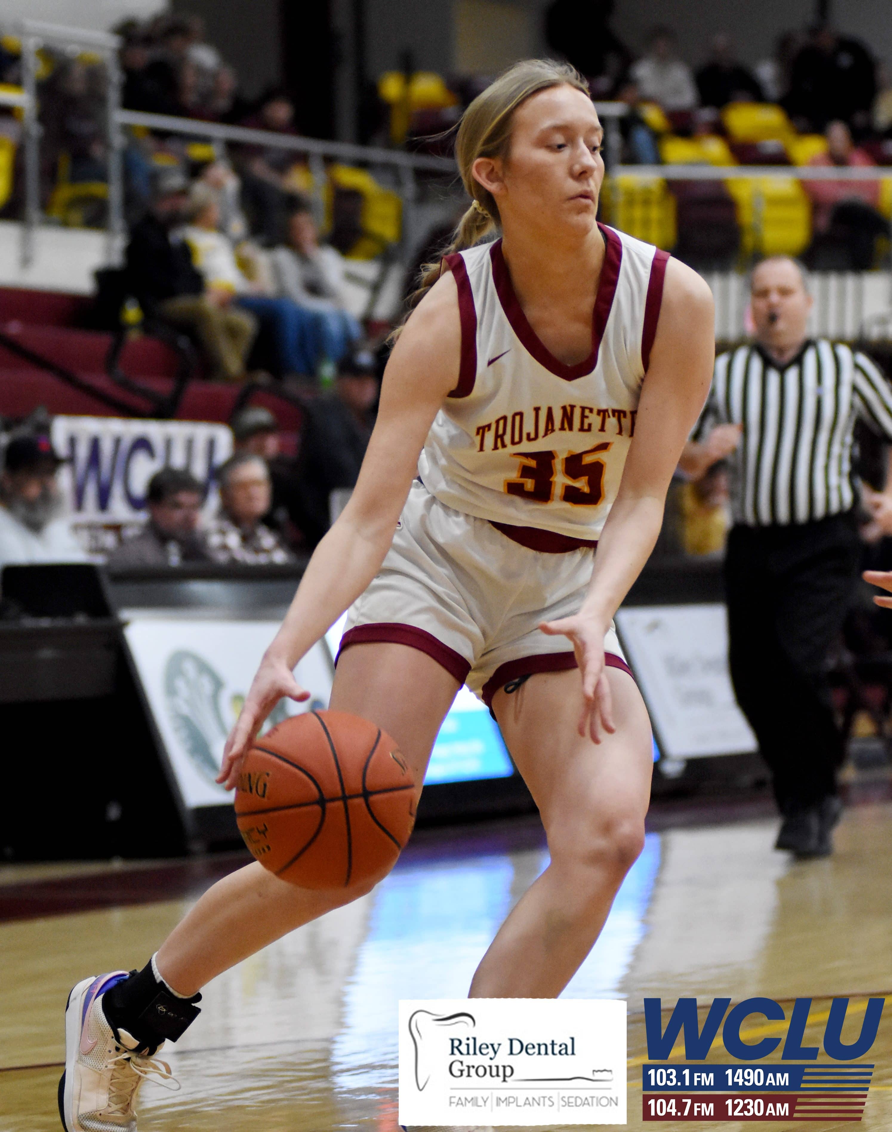 Barren County’s Mahalia Burton dribbles and looks to pass the ball against Metcalfe County. The Trojanettes lost, 47-38. James Brown/WCLU Sports
