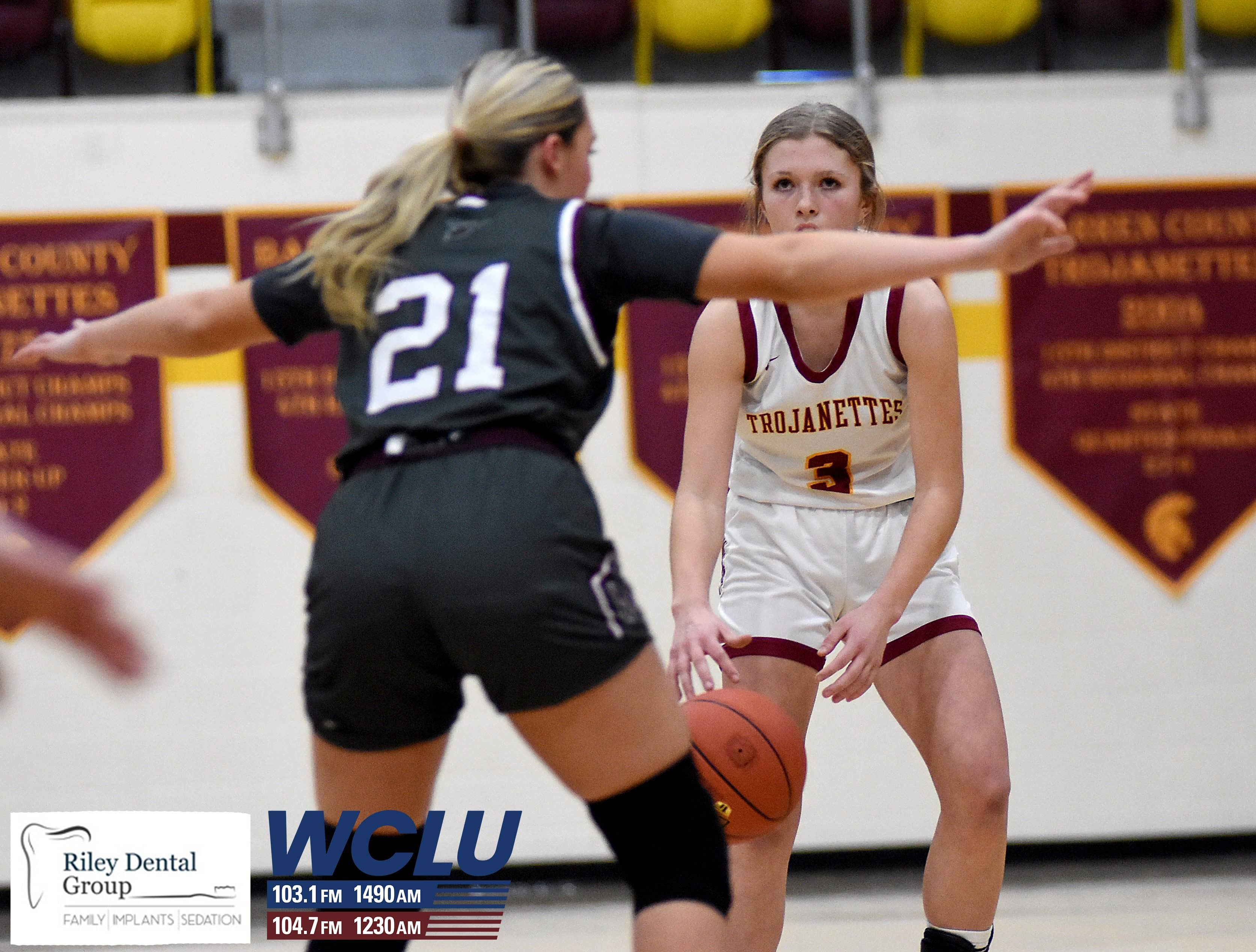 Barren County’s Katie Gearlds looks to pass the ball against Metcalfe County. The Trojanettes lost, 47-38. James Brown/WCLU Sports