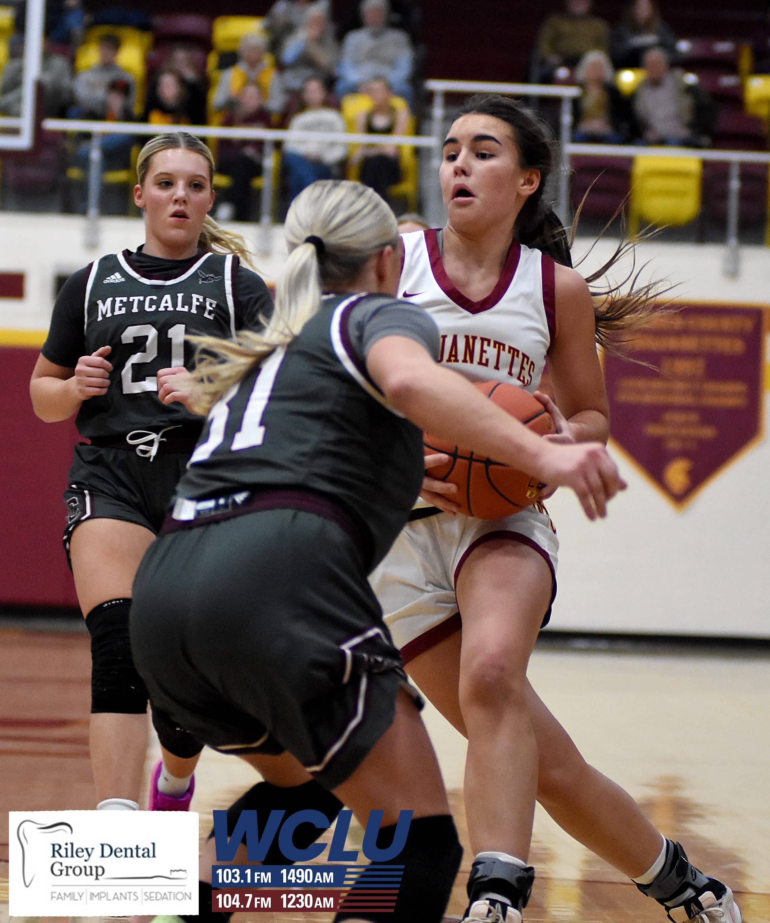 Barren County’s Ann Ashley Atkinson drives against Metcalfe County. The Trojanettes lost, 47-38. James Brown/WCLU Sports