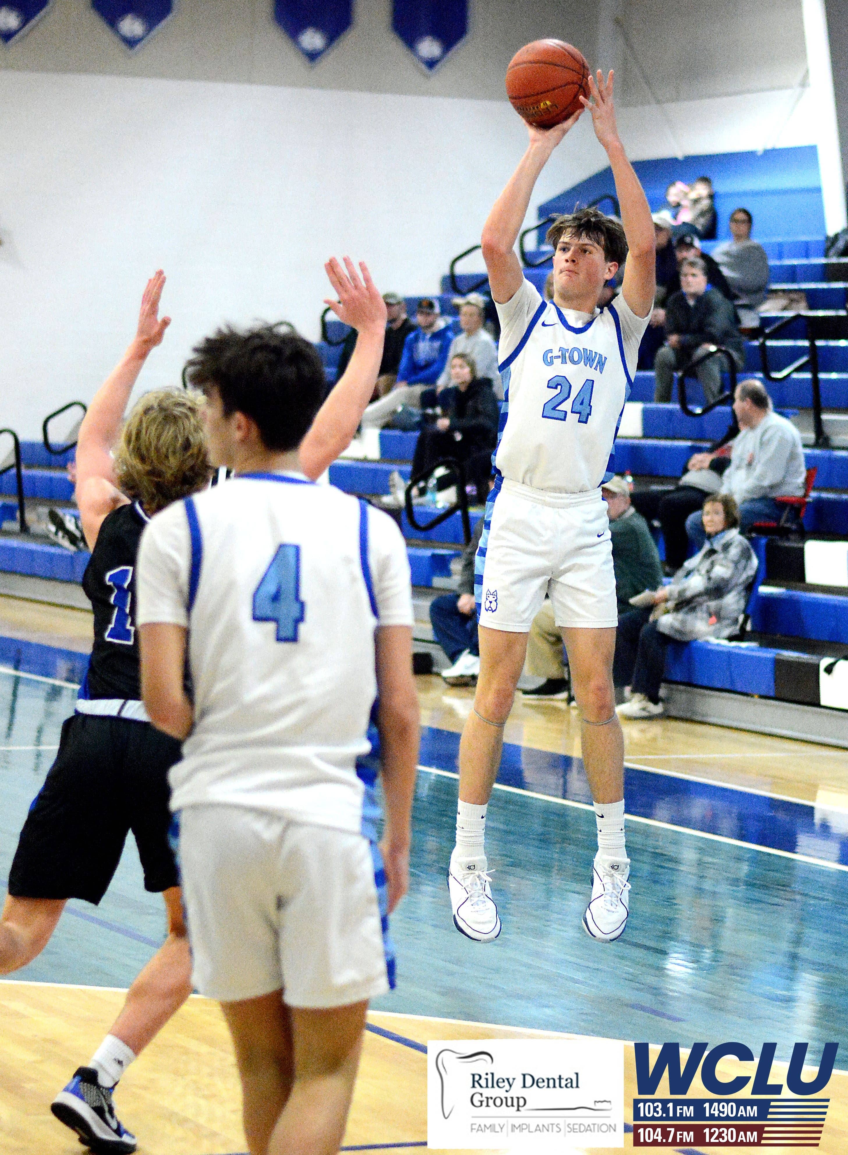 Glasgow’s Carter Hodges shoots a 3-pointer against LaRue County. Glasgow lost, 80-40. John Brown/WCLU Sports