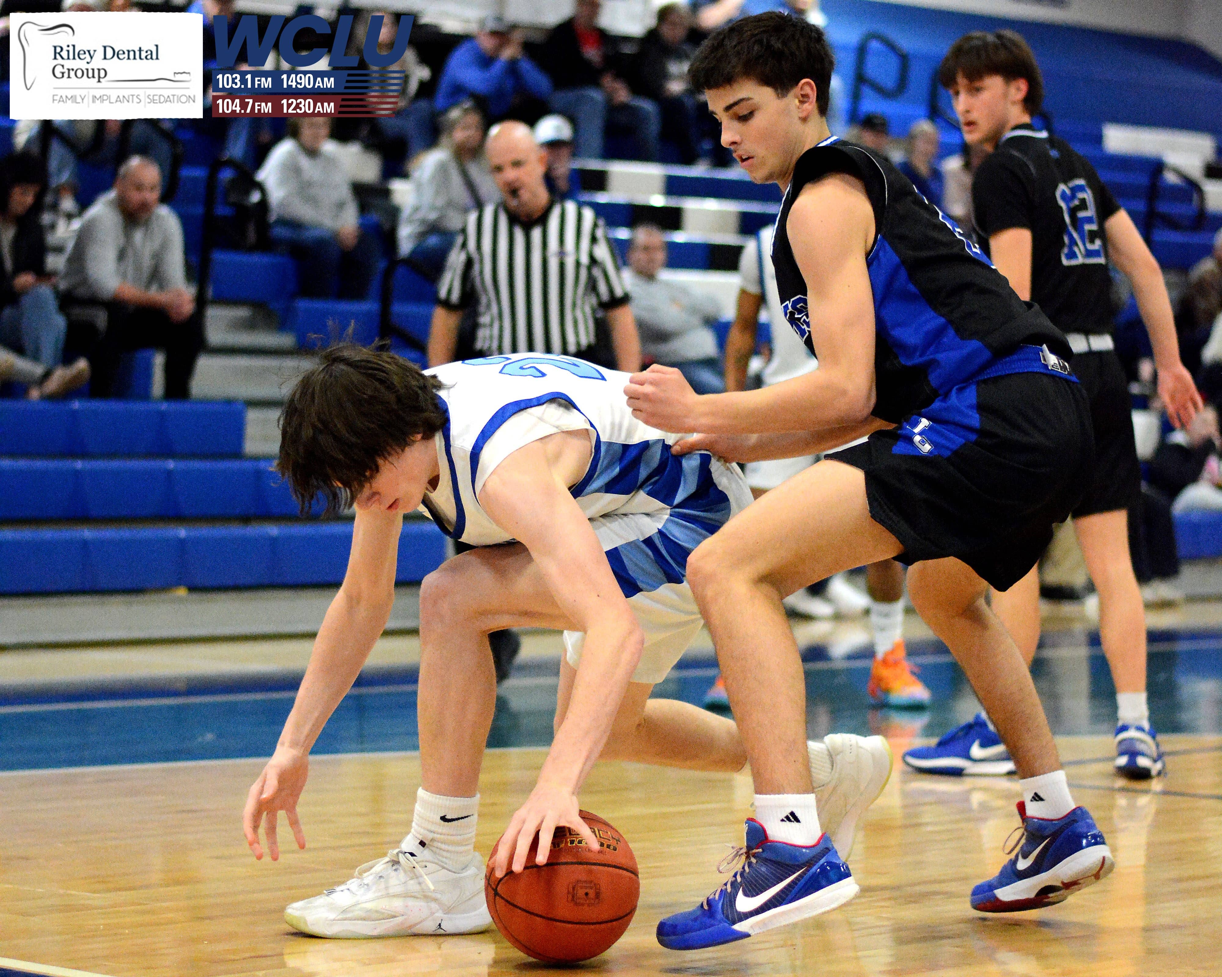 Glasgow’s Colby Brewster battles for a loose ball against LaRue County. Glasgow lost, 80-40. John Brown/WCLU Sports