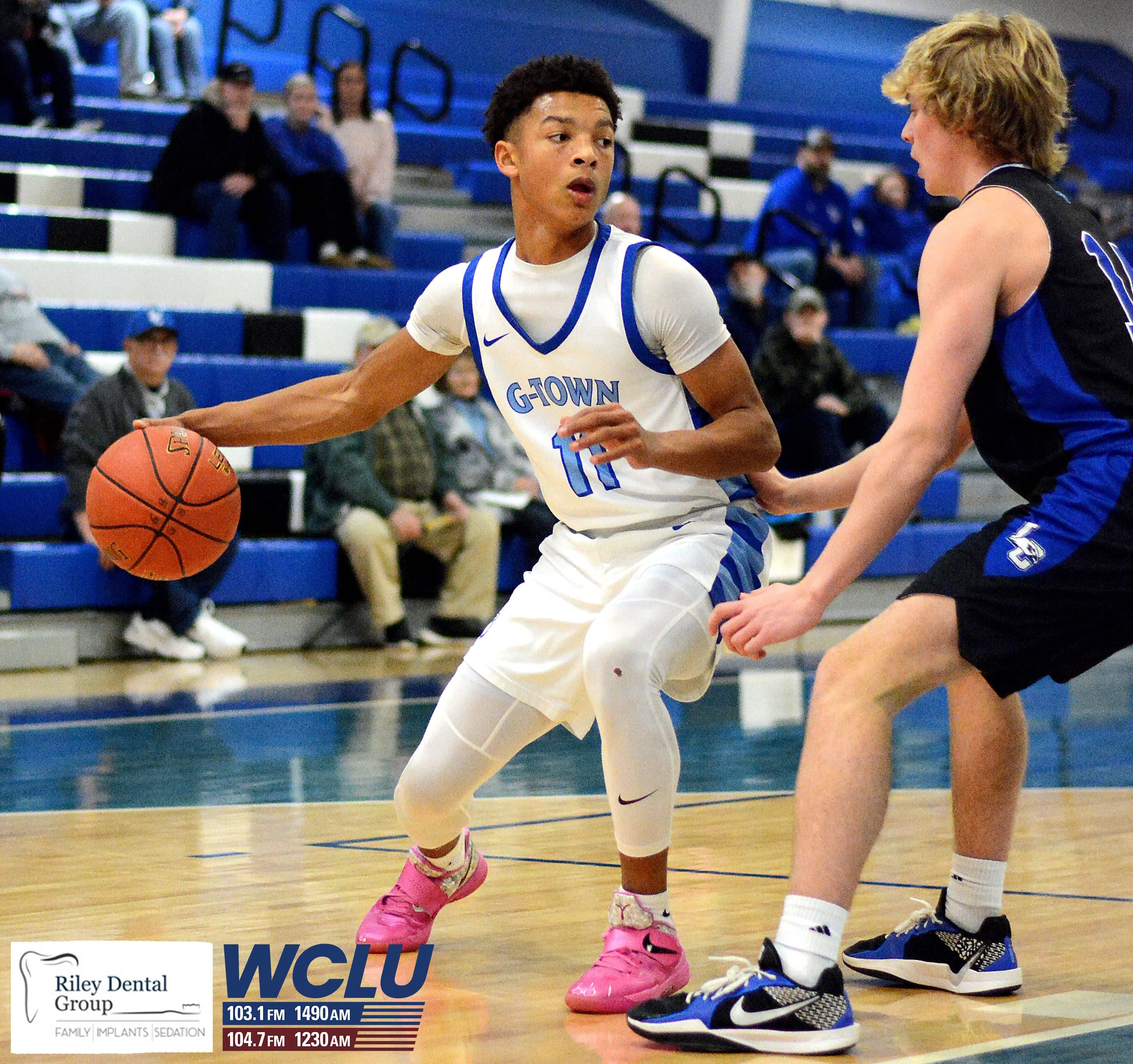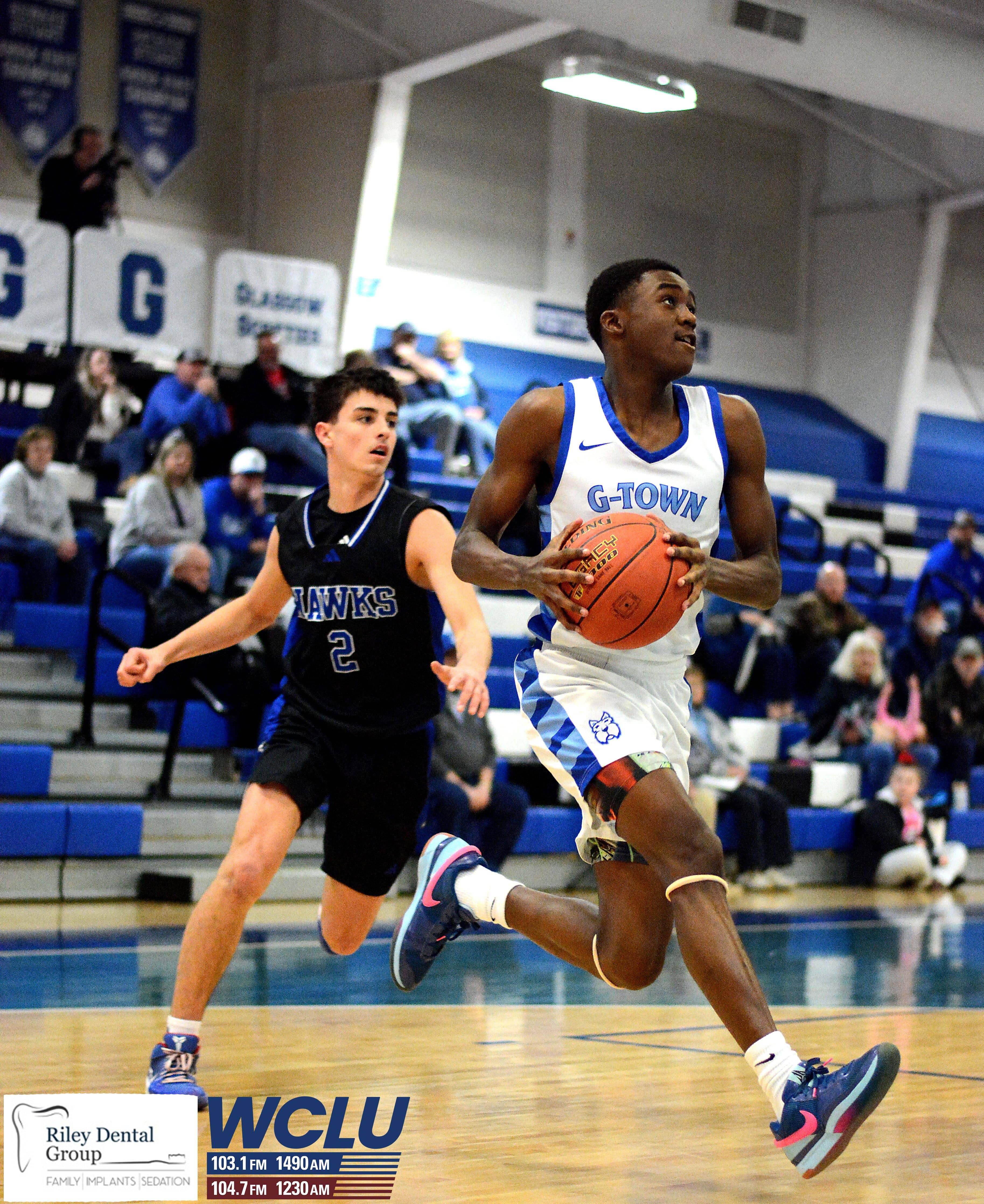Glasgow’s Jaylen Bradley dribbles near the baseline against LaRue County. Glasgow lost, 80-40. John Brown/WCLU Sports