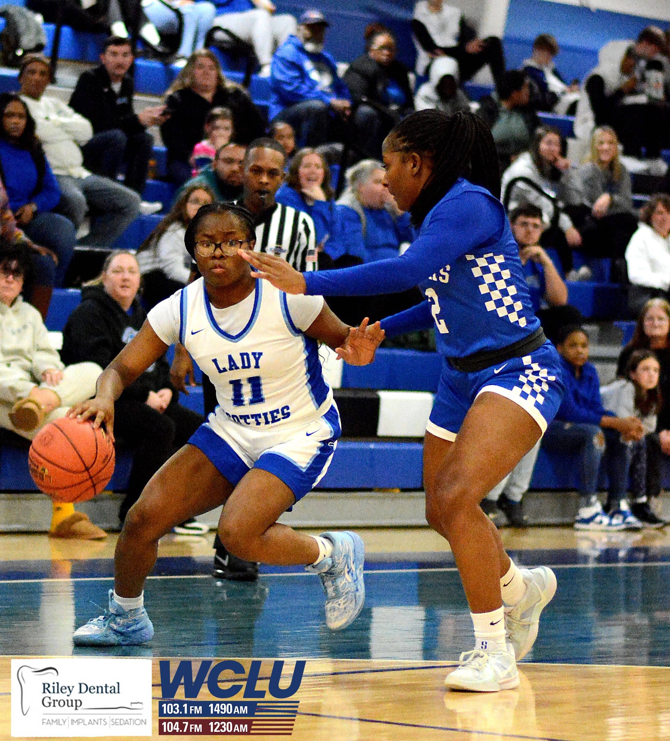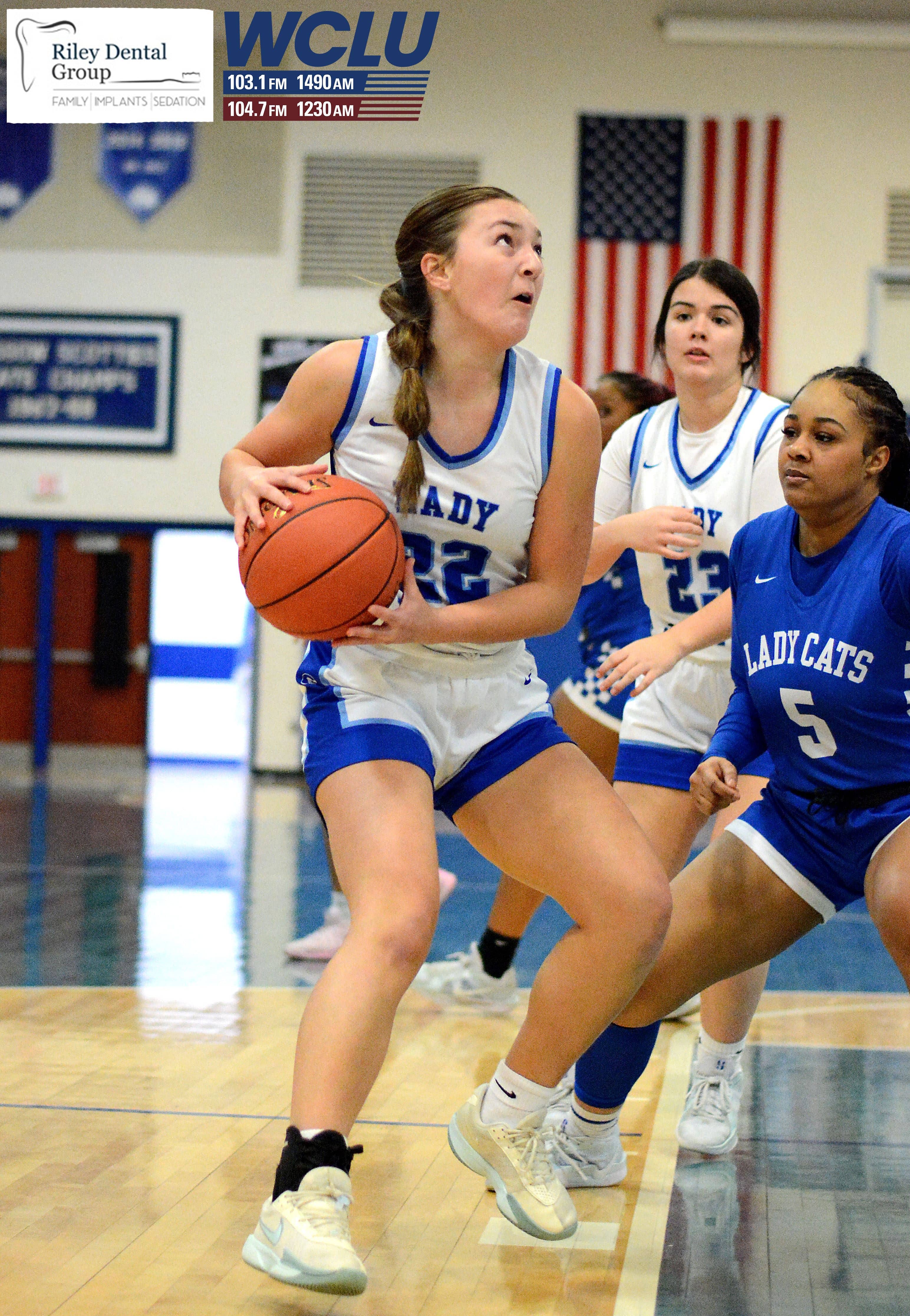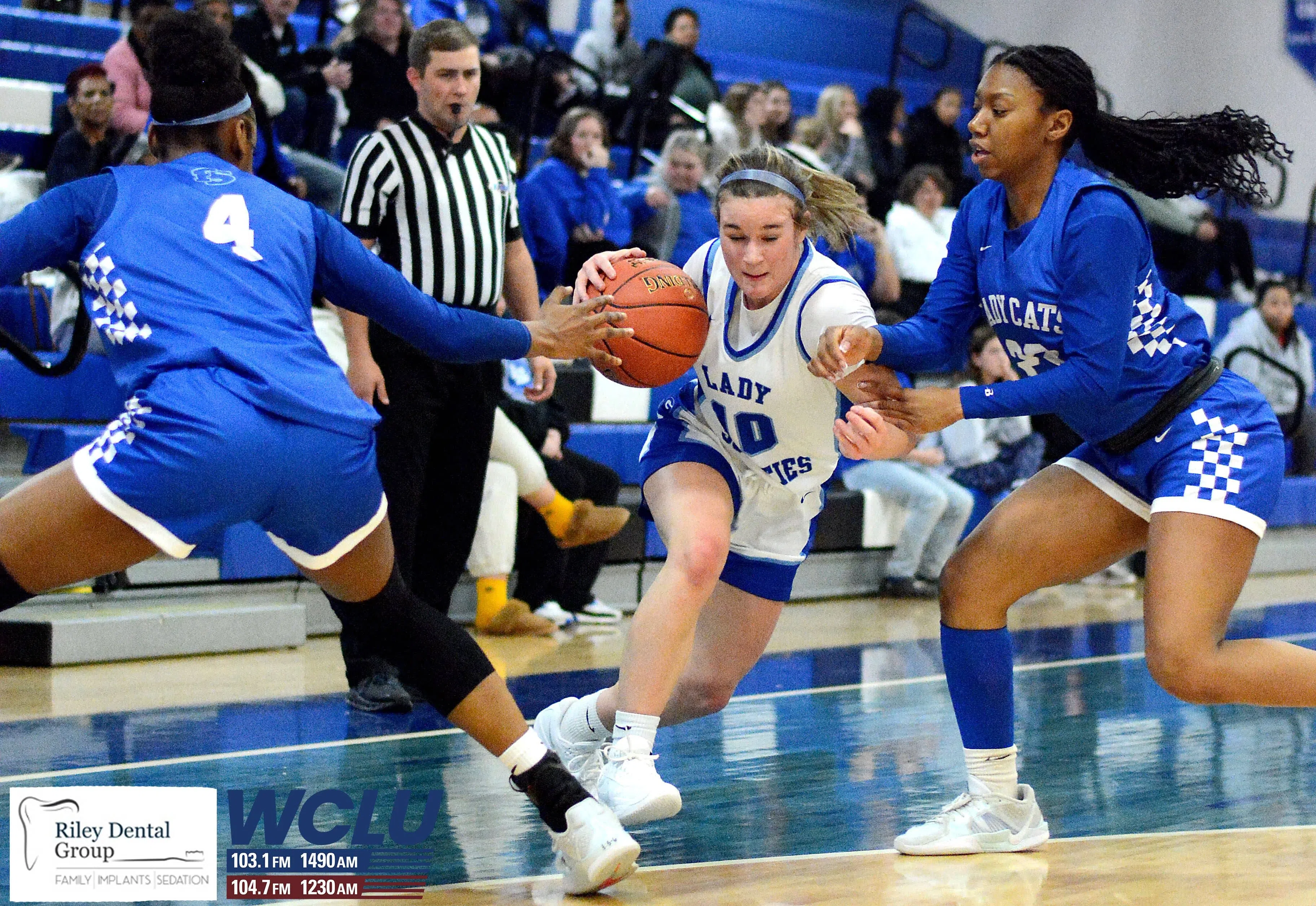 Glasgow’s Kayla Kirkpatrick splits two defenders on a drive against Franklin-Simpson. Glasgow lost, 65-40. John Brown/WCLU Sports