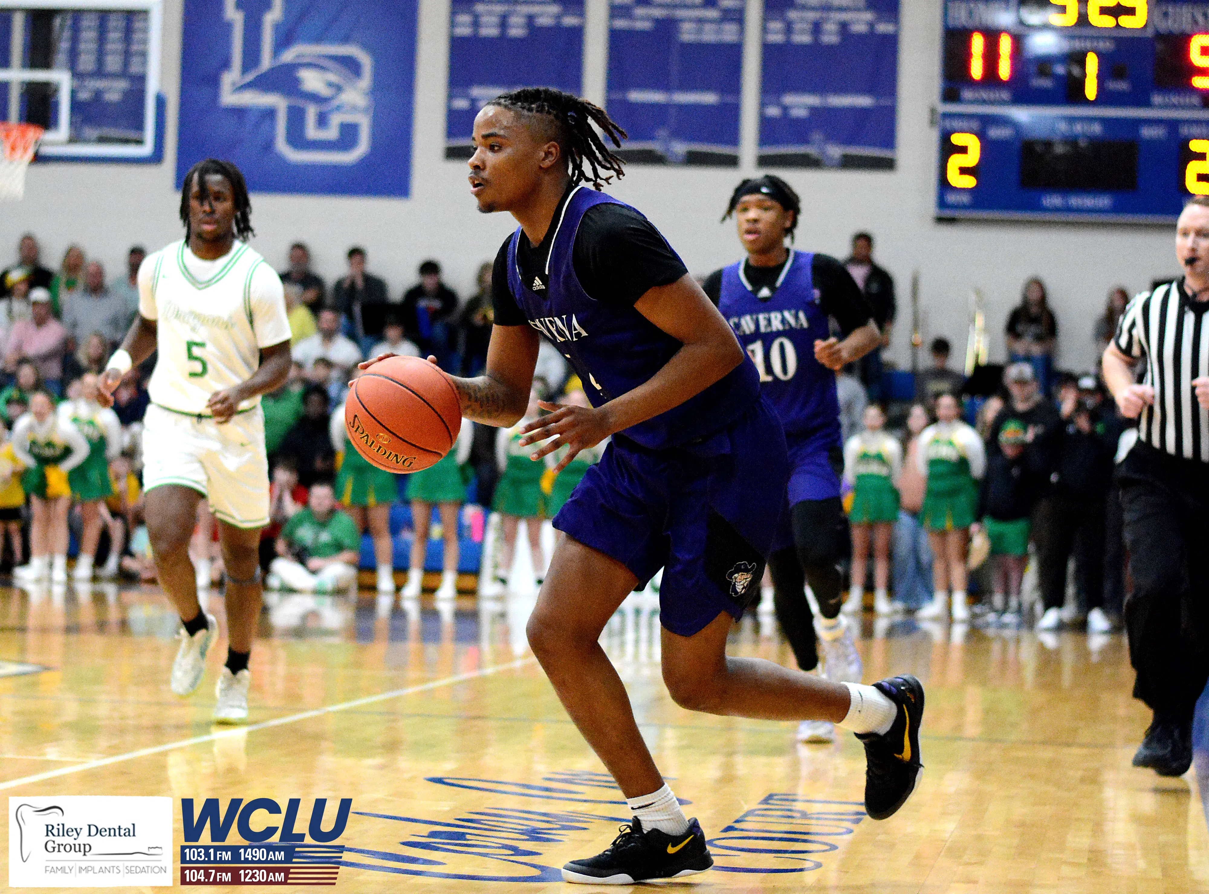 Caverna’s Russell Williams dribbles at the perimeter against Green County in the Boys’ 18th District Tournament. Caverna lost, 62-53. John Brown/WCLU Sports