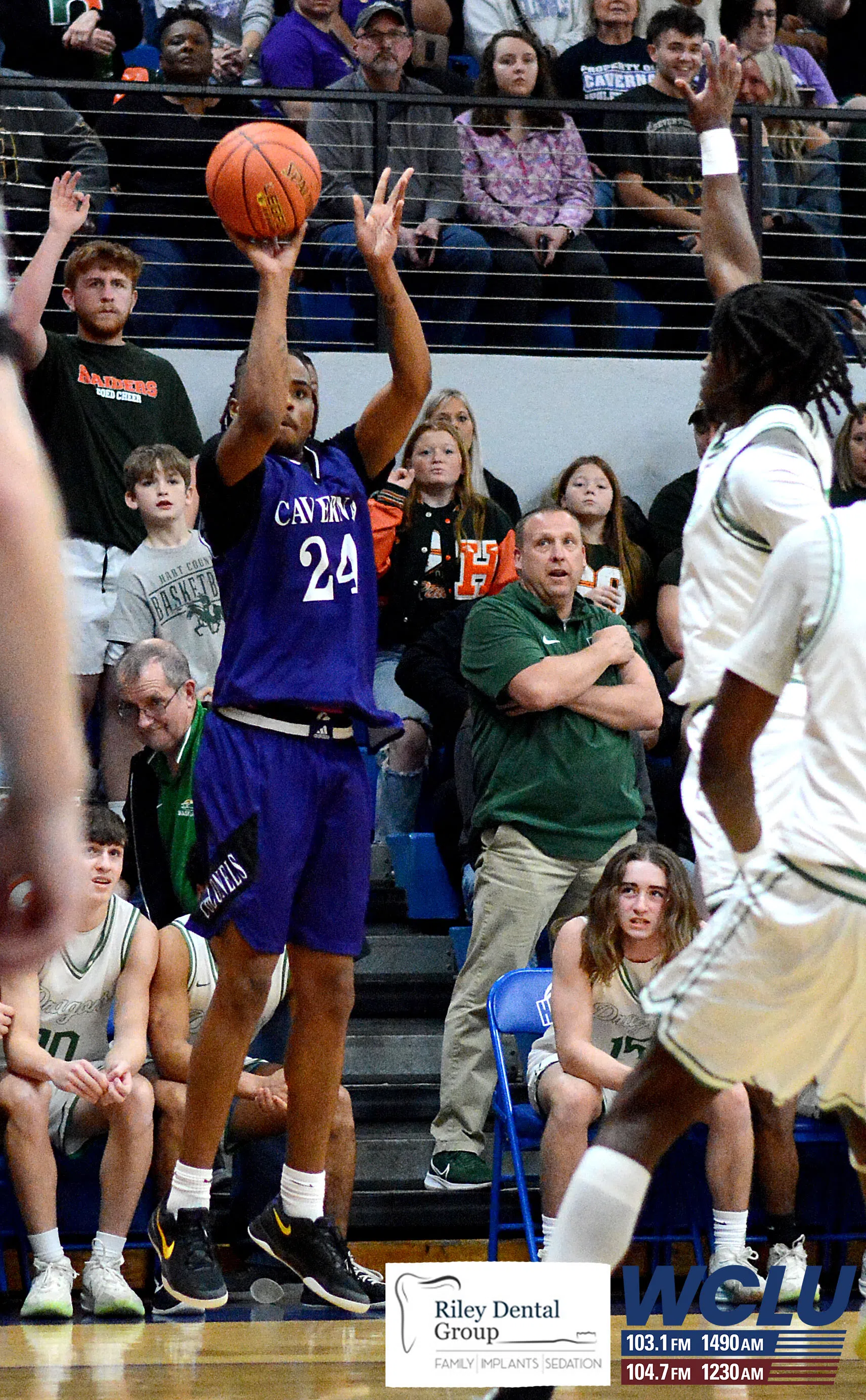 Caverna’s Russell Williams shoots a 3-pointer against Green County in the Boys’ 18th District Tournament. Caverna lost, 62-53. John Brown/WCLU Sports