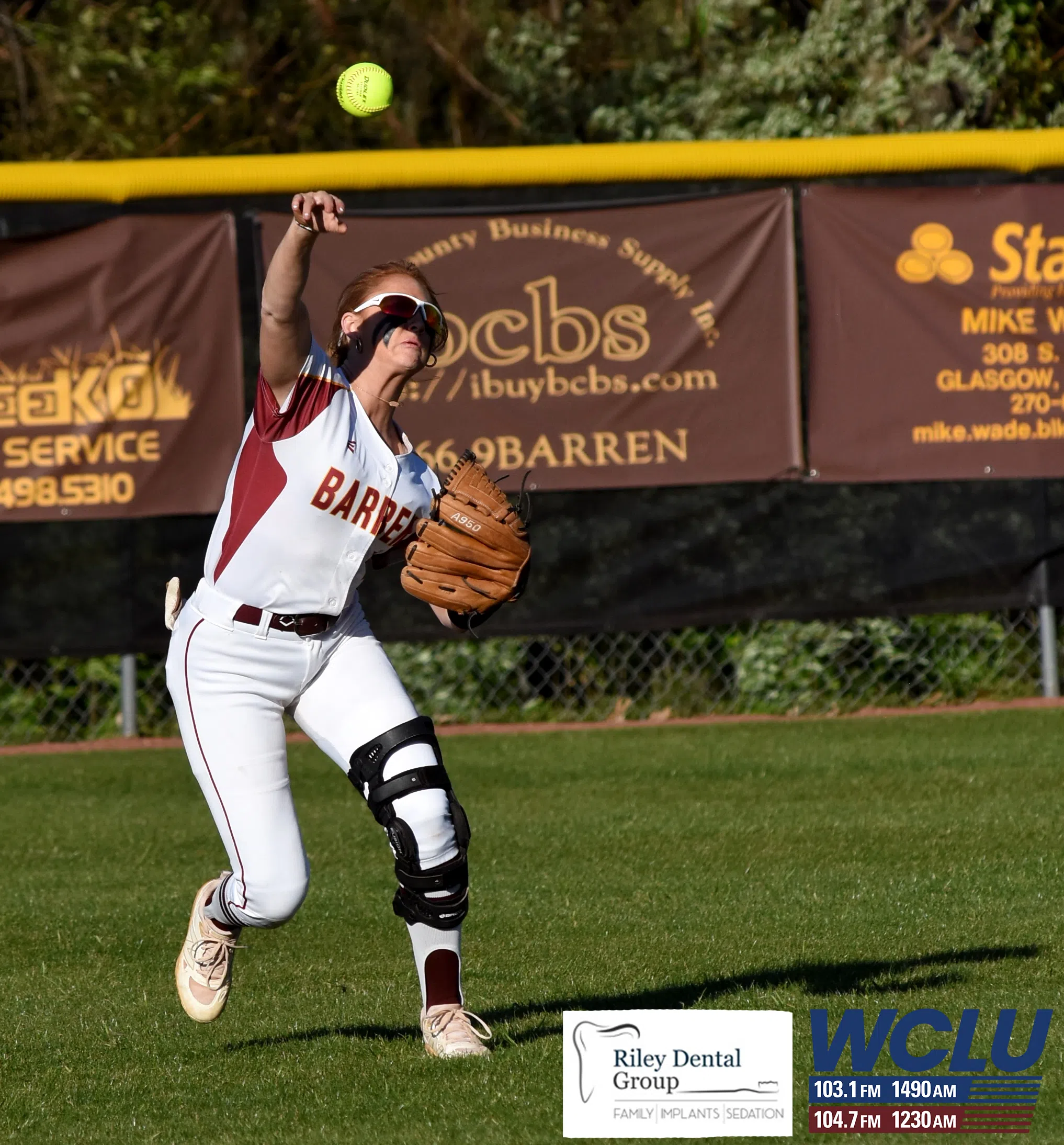 Barren County’s Kyra Moore settles under a fly ball in left field against Warren East in a 15th District contest. The Trojanettes won, 10-4. James Brown/WCLU Sports