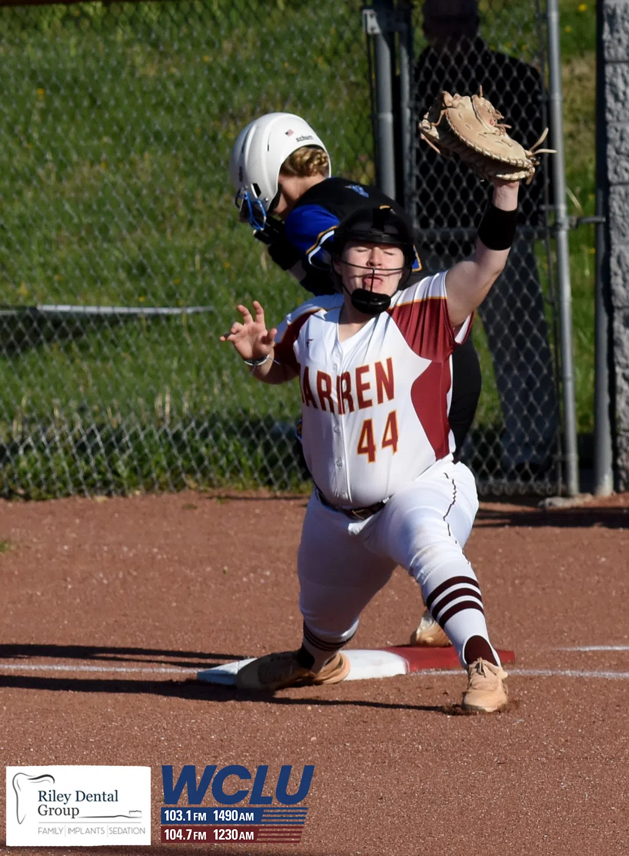 Barren County’s Lizzie Smith stretches for the ball at first base against Warren East in a 15th District contest. The Trojanettes won, 10-4. James Brown/WCLU Sports