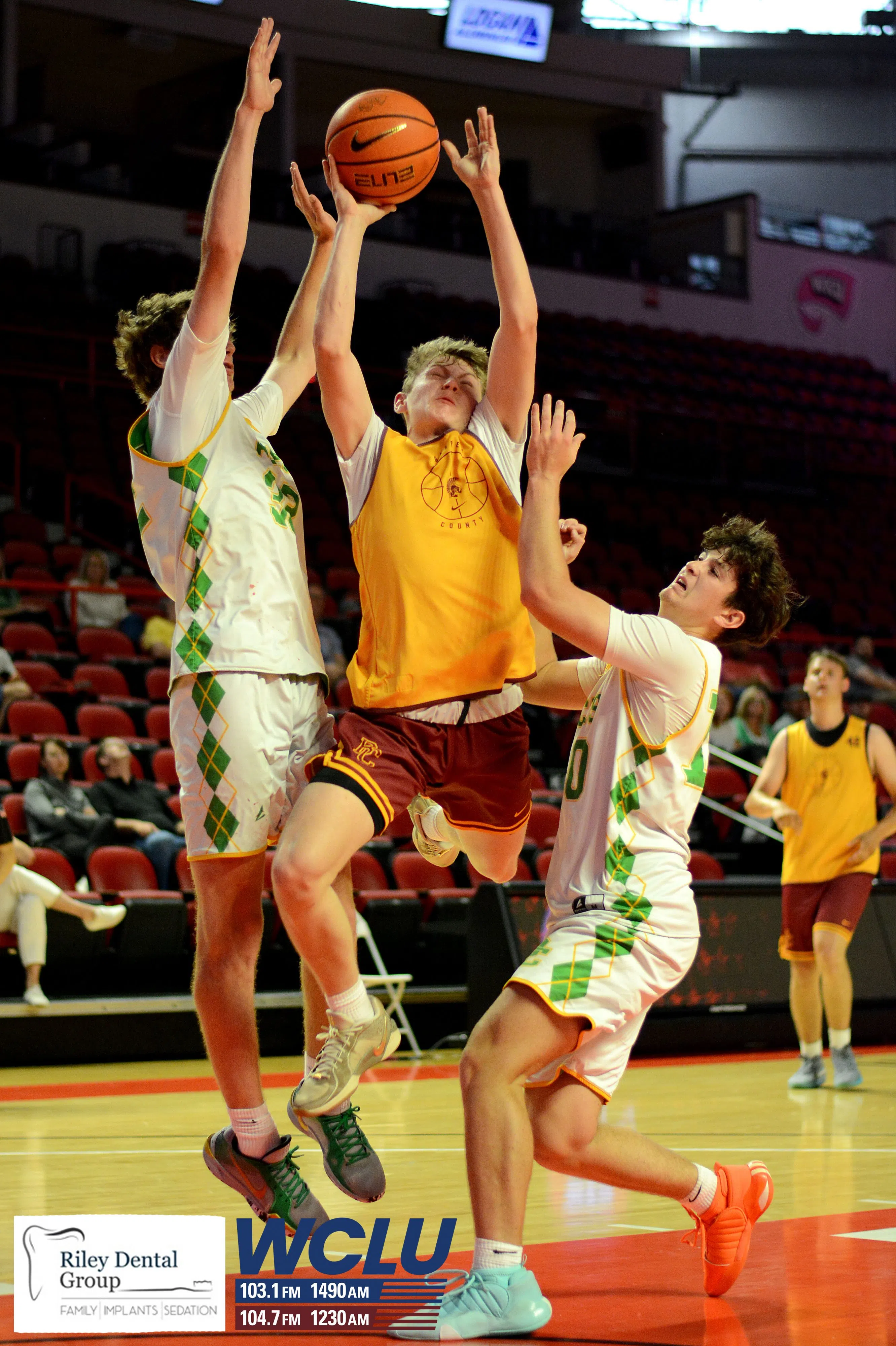 Barren County’s Weston Shelton shoots between two defenders against Owensboro Catholic in a summer camp game at WKU. John Brown/WCLU Sports