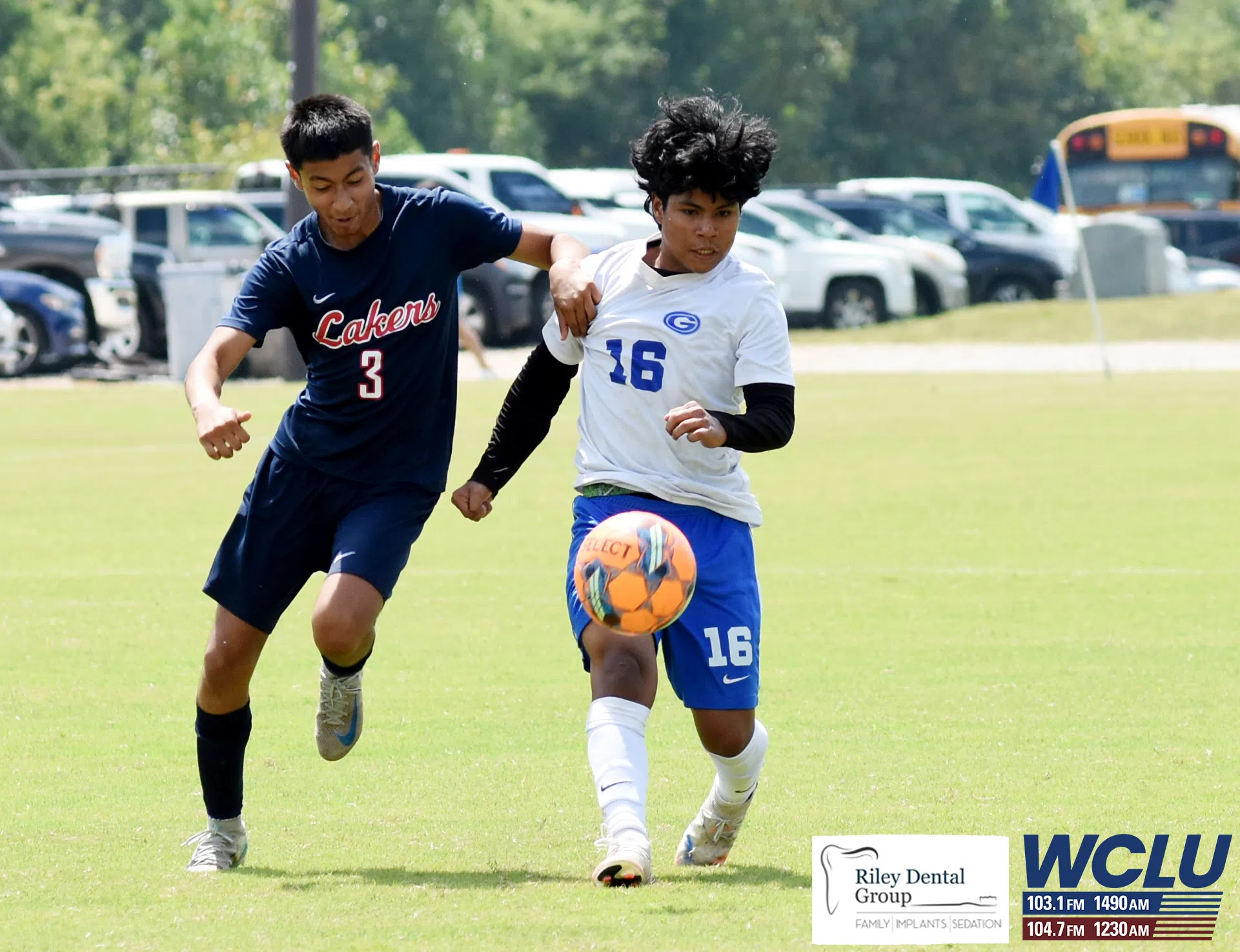 Glasgow’s Wilson Barrios battles for the ball against Russell County. The Scotties tied the Lakers, 0-0. James Brown/WCLU Sports