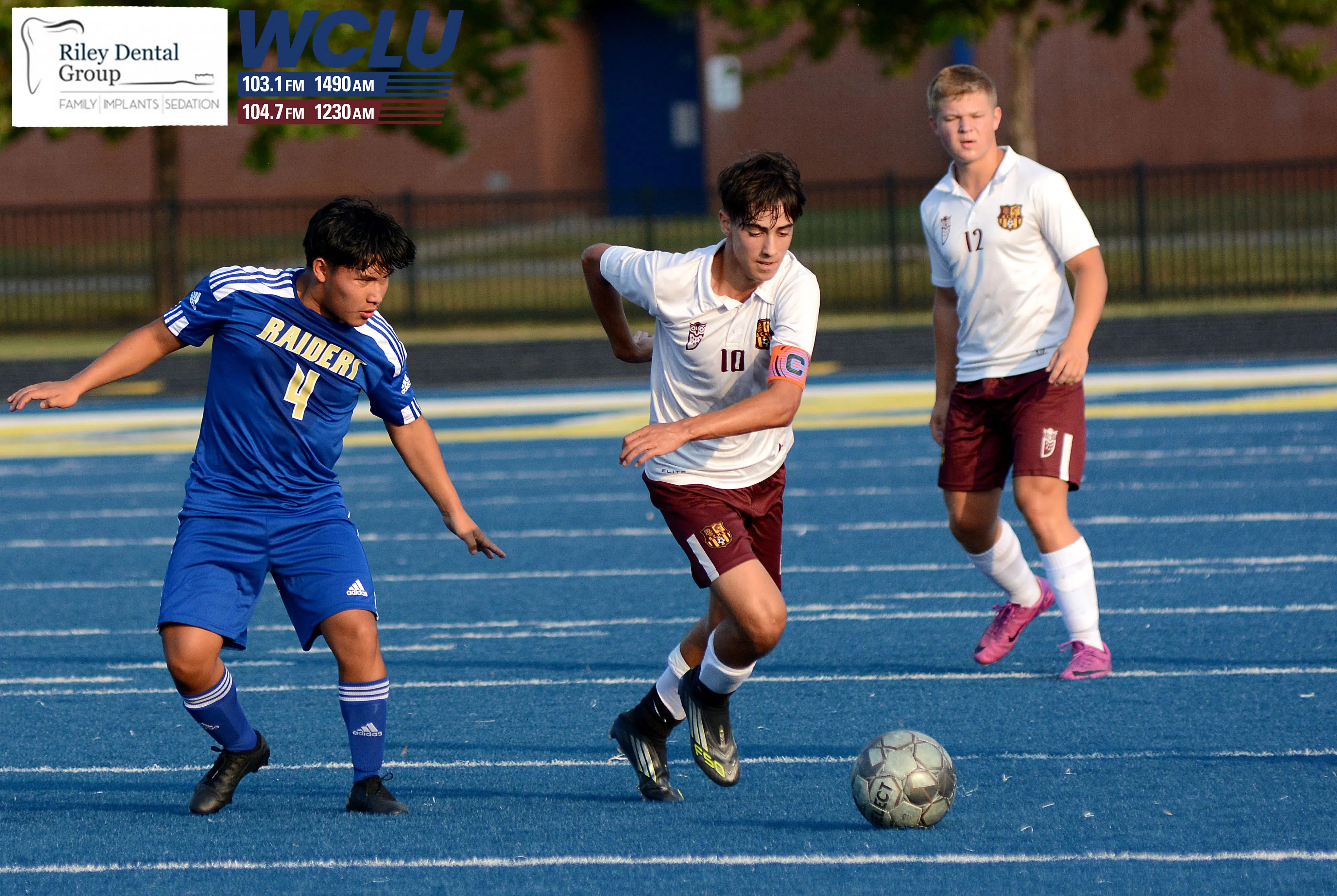 Barren County’s Gabriel Nyekan defends as Jakeb Walden runs back into position against Warren East. The Trojans lost, 7-2. Auggie Brown/WCLU Sports